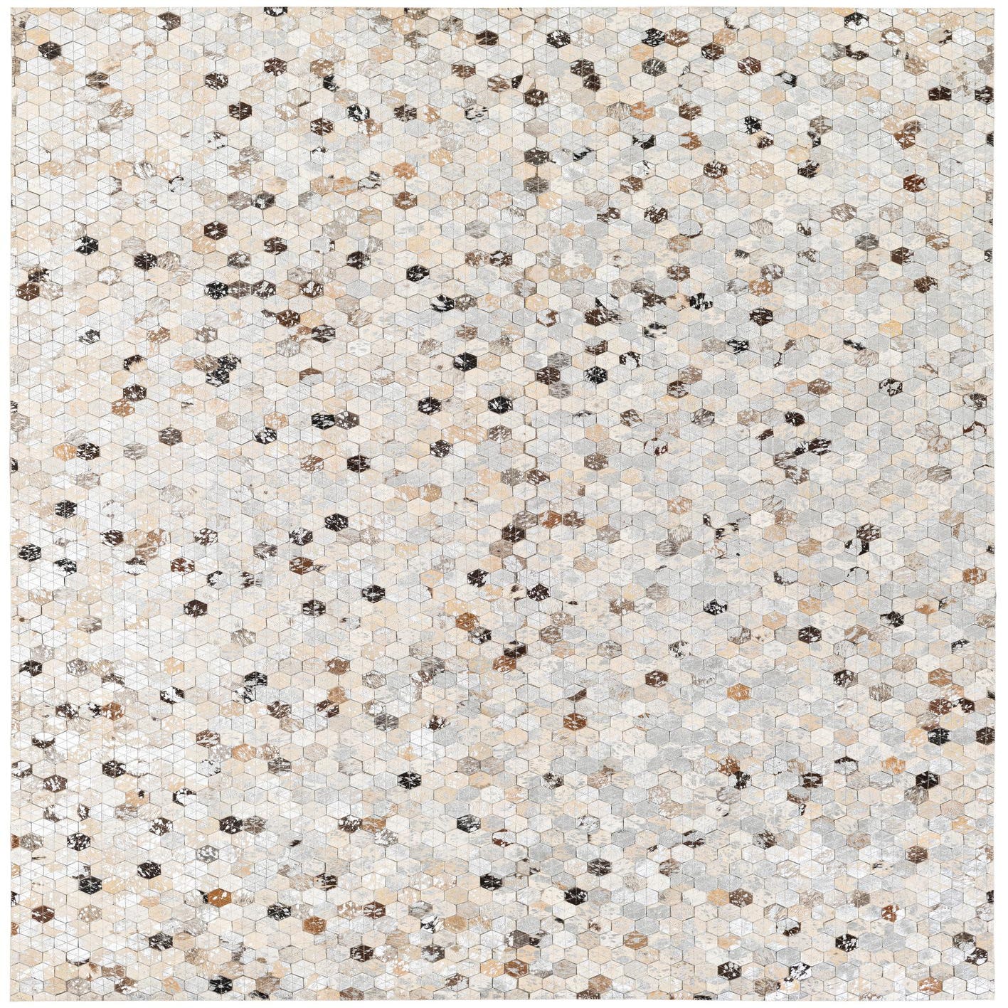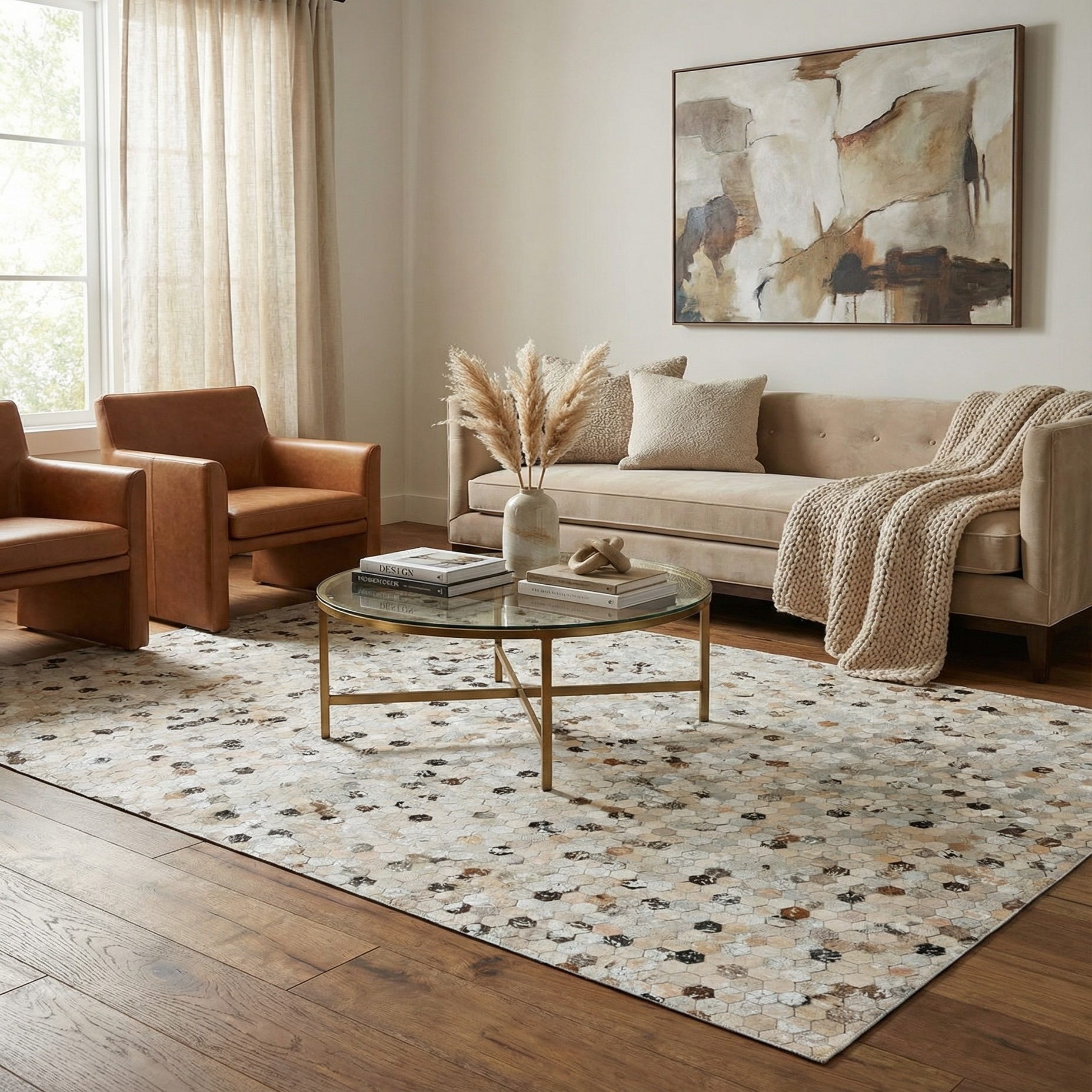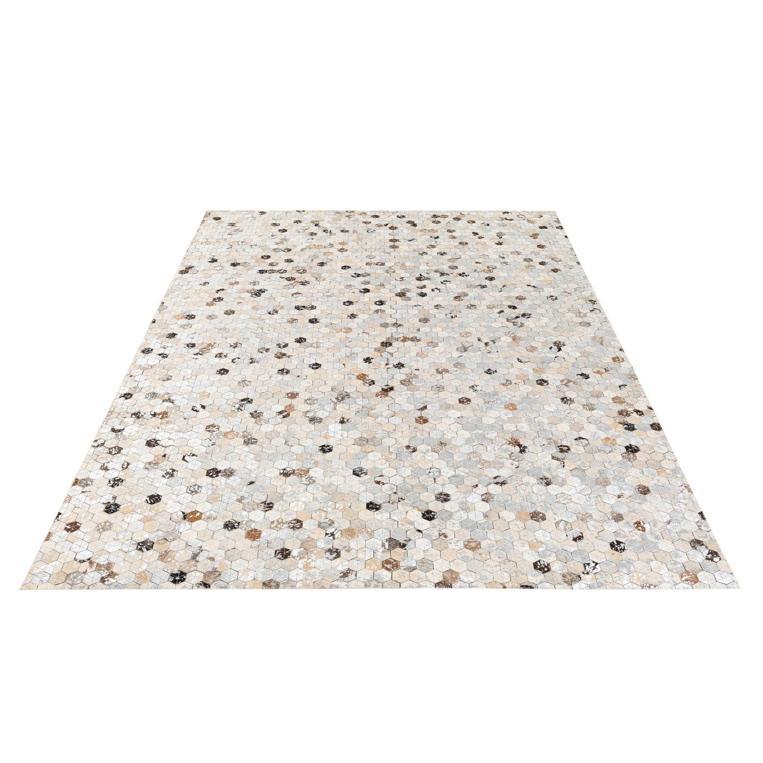 A 5x7 rectangular multi-colored modern cowhide rug featuring a mosaic of small hexagonal patches in varying shades of cream, beige, grey, and dark brown.