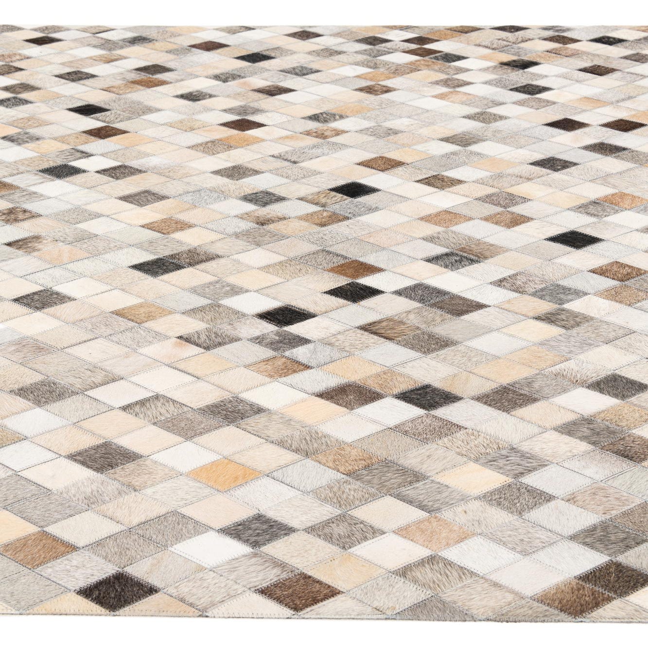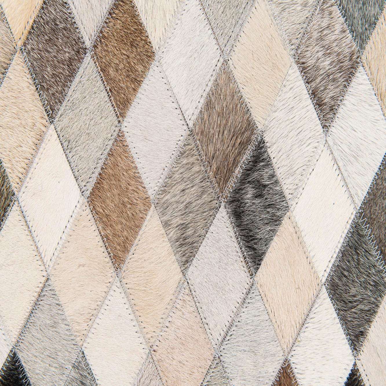 A 5x7 rectangular Cowhide Stocks rug by Rugs.com, featuring a modern multi-colored diamond pattern in various shades of brown, beige, cream, and black.