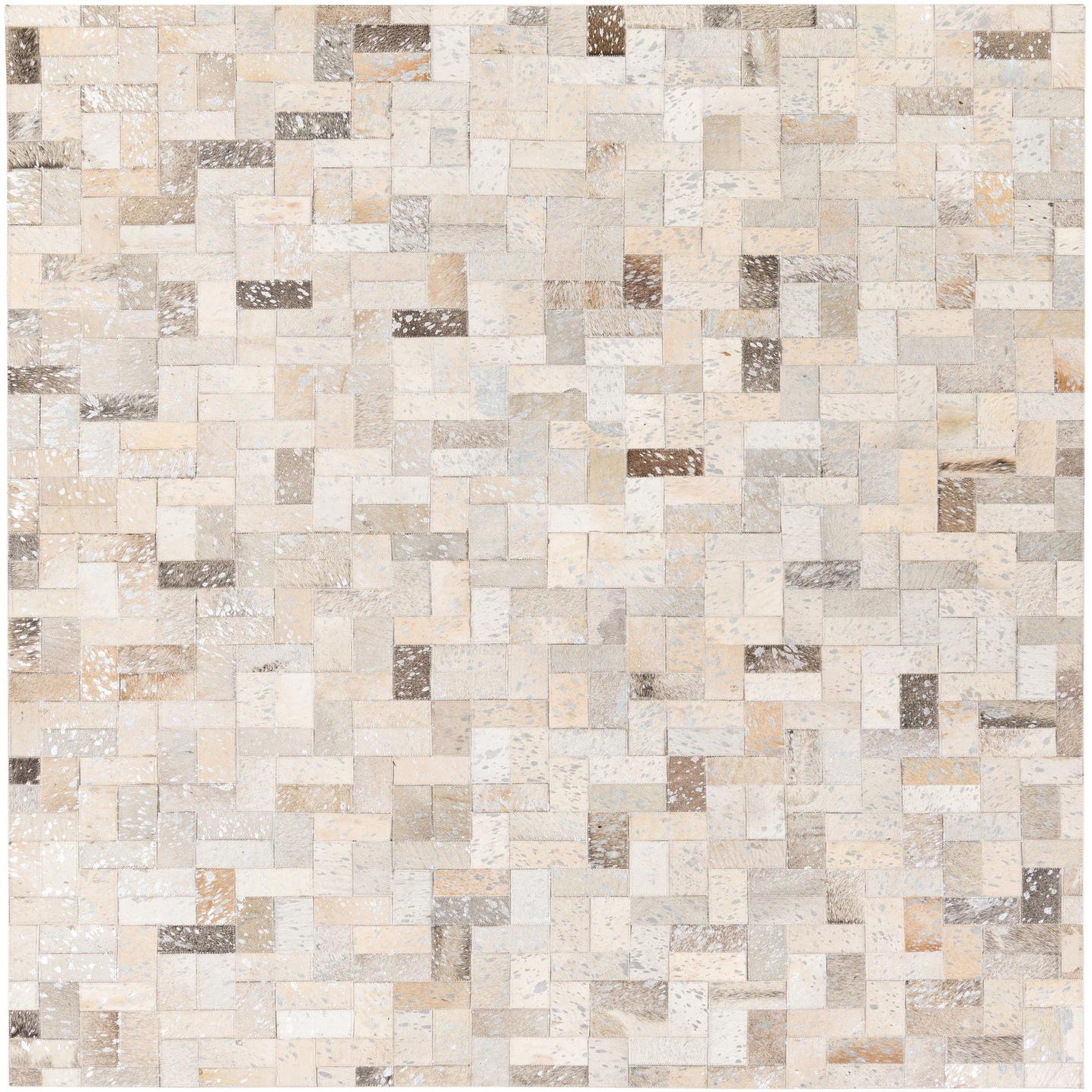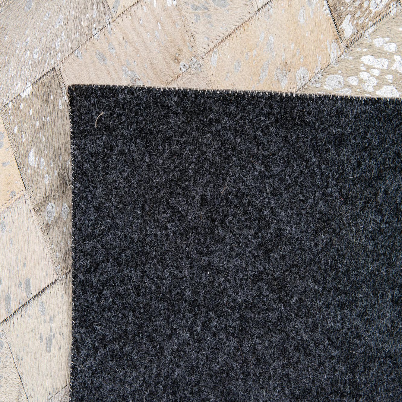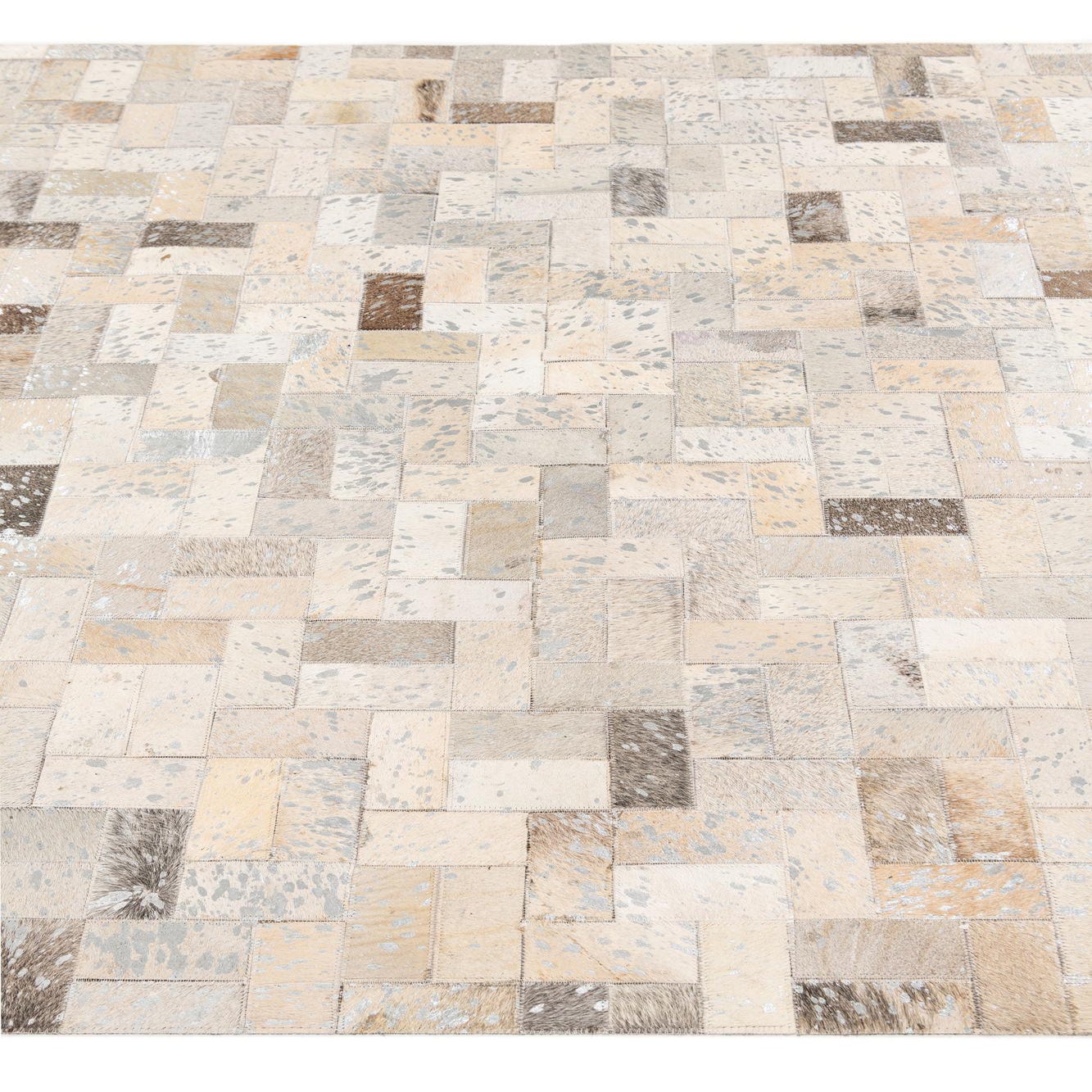 A low-profile patchwork of small rectangular tiles creates a quietly graphic pattern that brings movement without overwhelming a room. Hand-made of cowhide and leather, the surface shows natural hair-on-hide texture with a soft sheen and visible stitch lines that add subtle, tactile depth. Colors include multi (background), beige, ivory, gray, brown, black, and touches of silver, arranged to deliver a neutral palette with warm and cool notes working together.