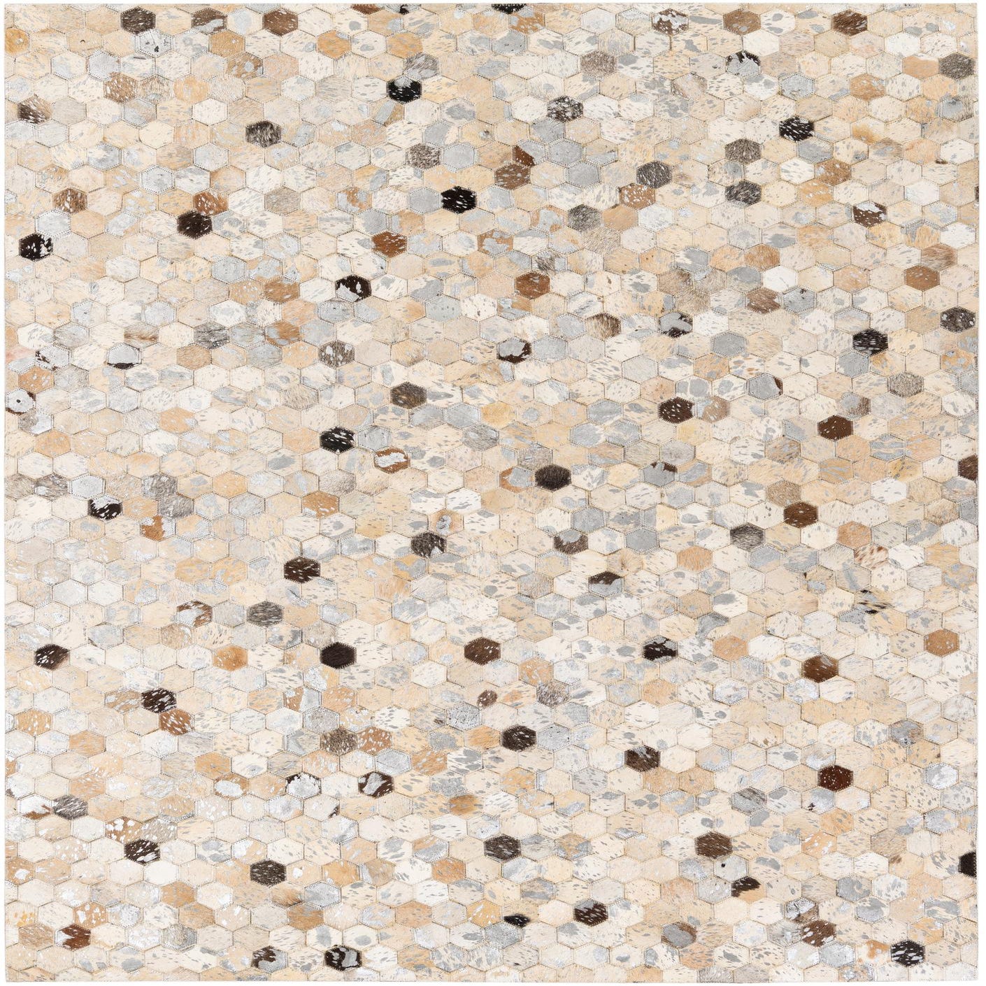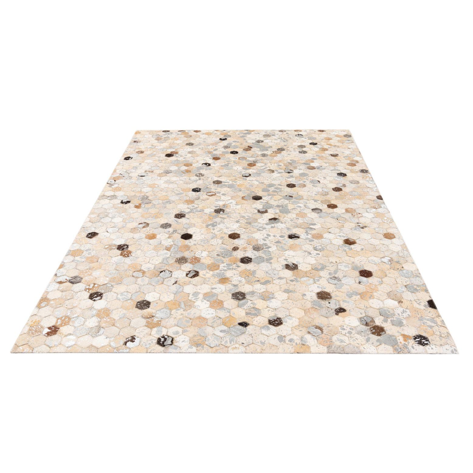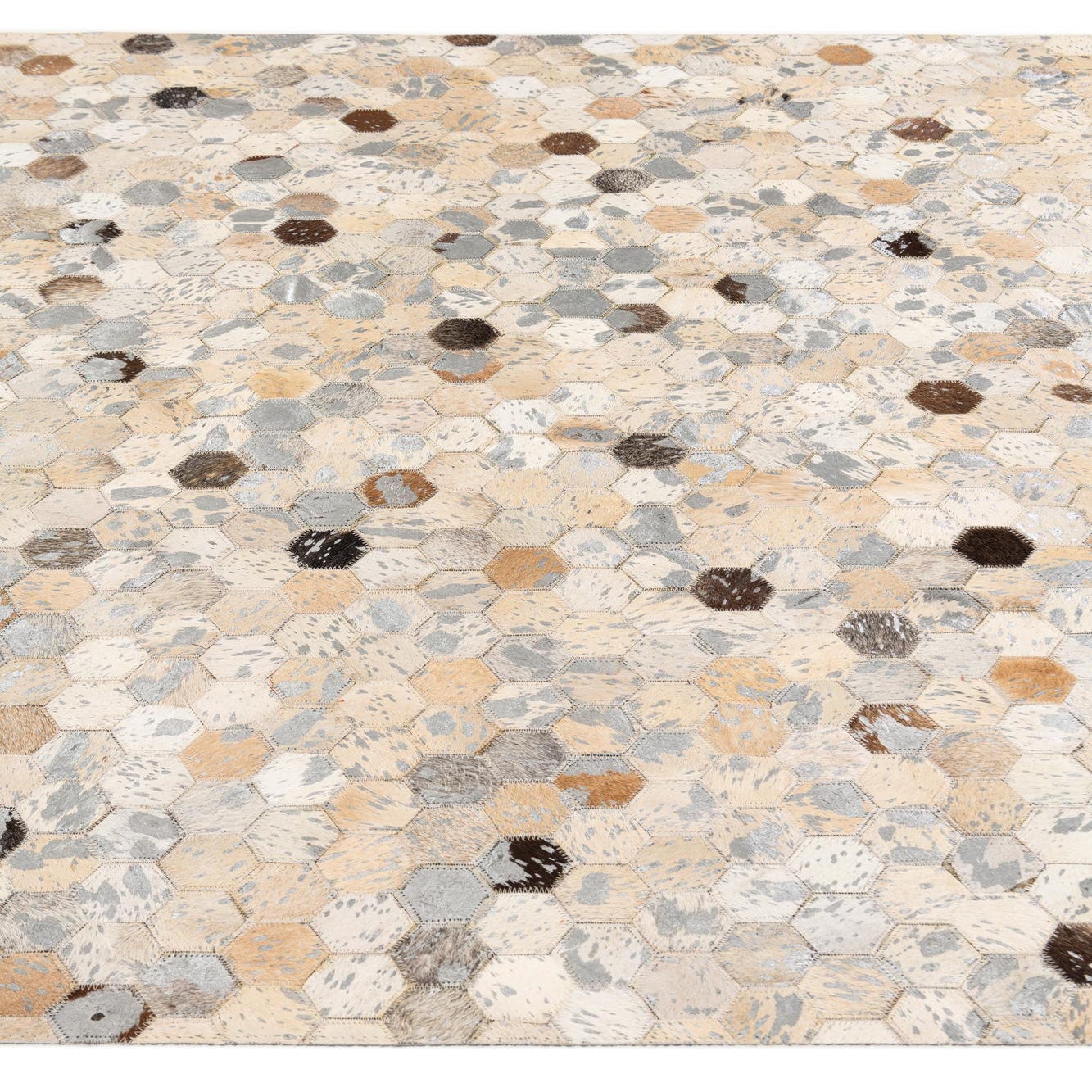 A 5x7 rectangular multi-colored cowhide rug featuring a modern hexagonal patchwork pattern in various natural tones.