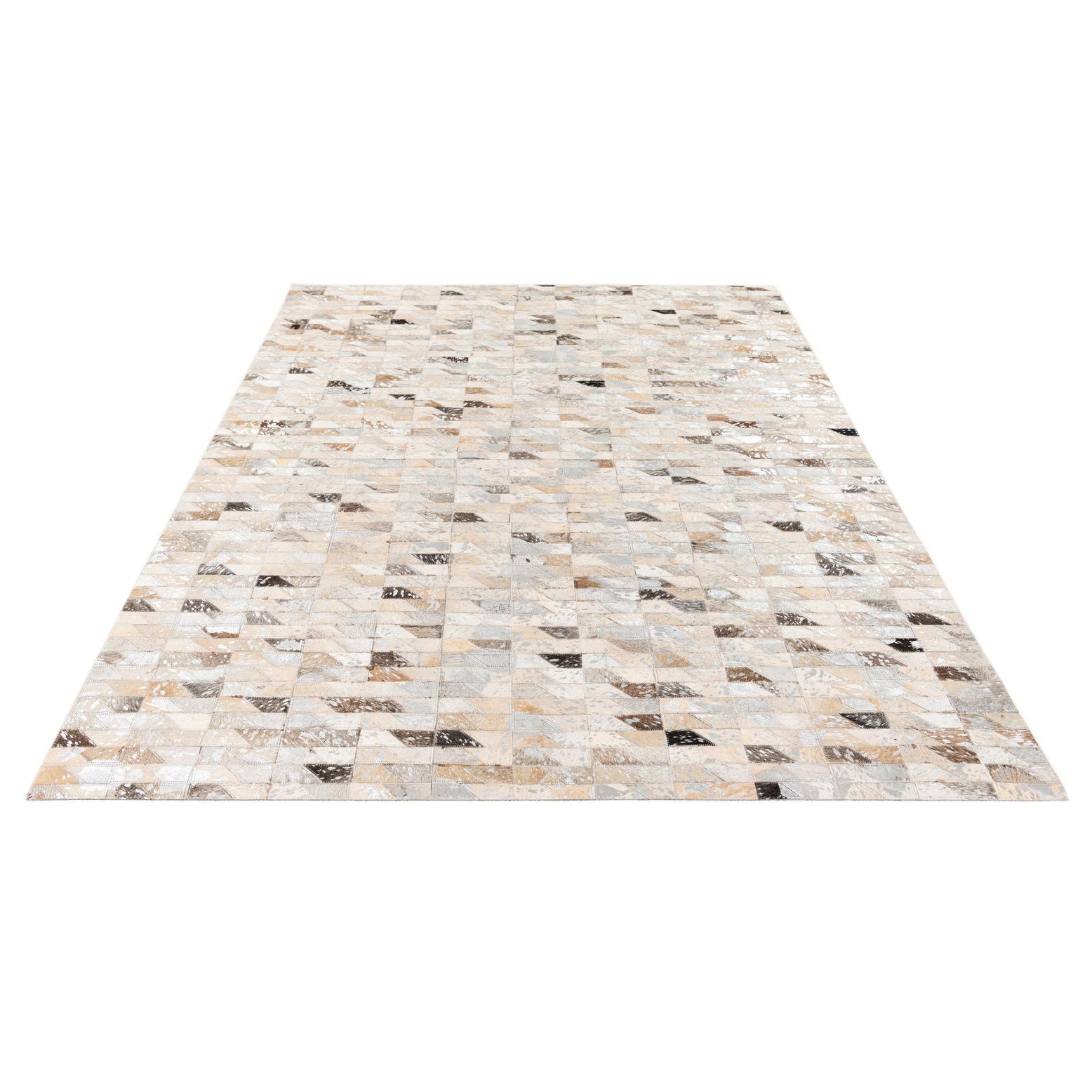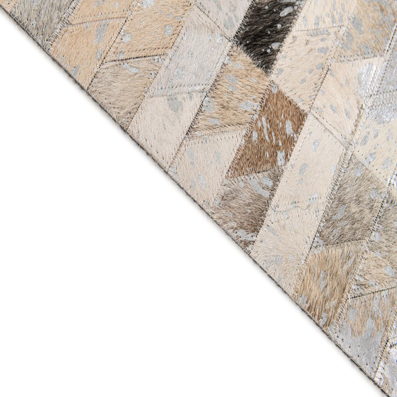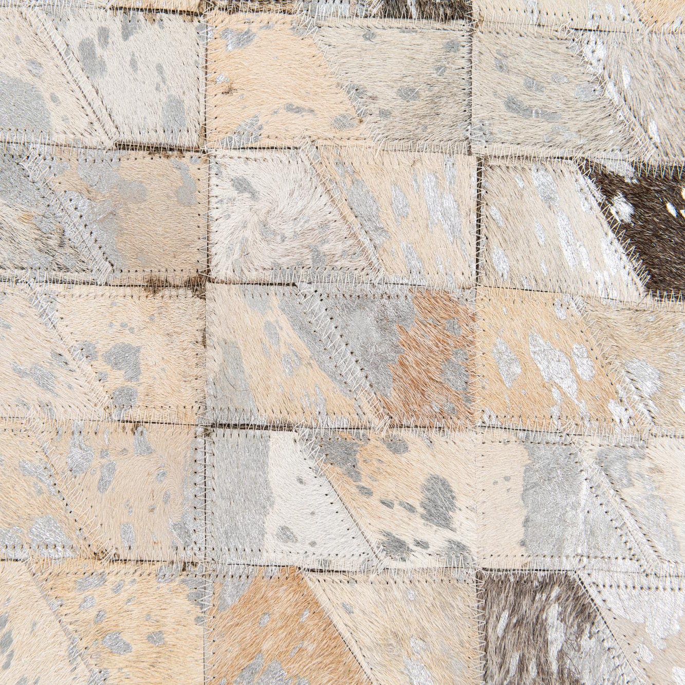 A 5x7 rectangular modern cowhide rug featuring a patchwork of multi-colored natural hide pieces in shades of beige, brown, and gray.