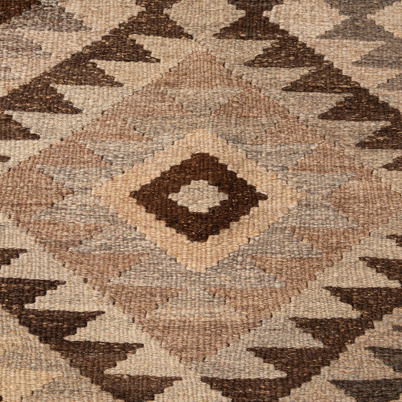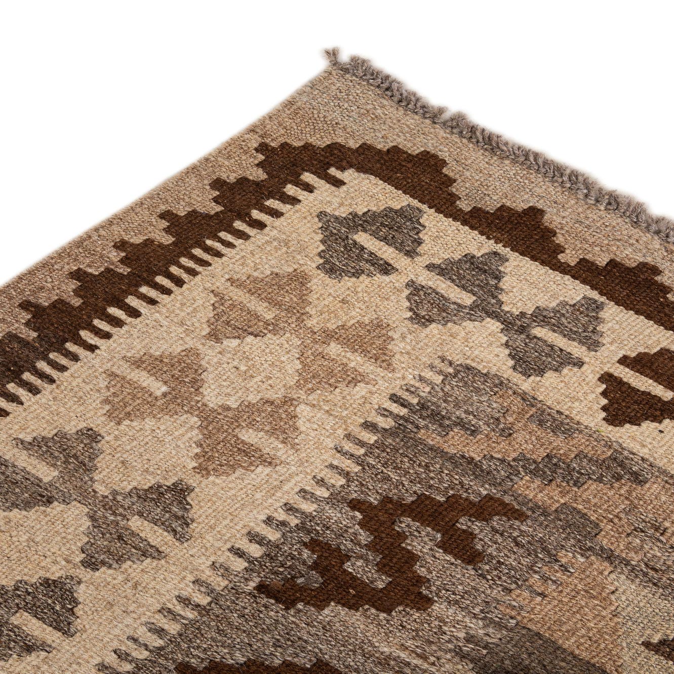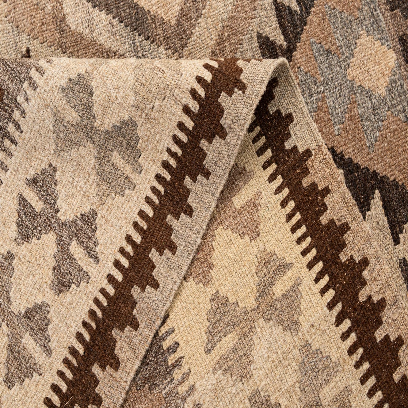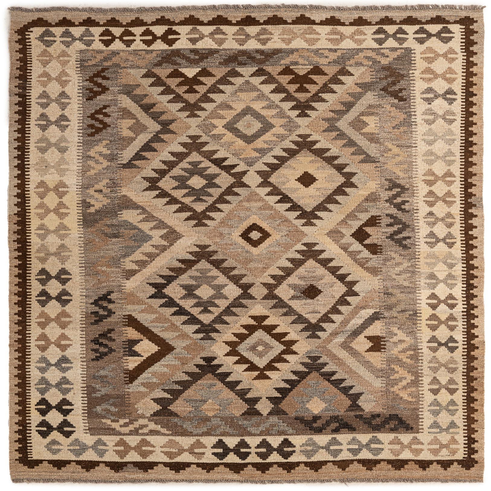A 5x7 rectangular Kilim Maymana rug featuring a multi-colored tribal pattern with geometric diamonds and triangles in shades of brown, beige, and gray, suitable for an indoor living space.