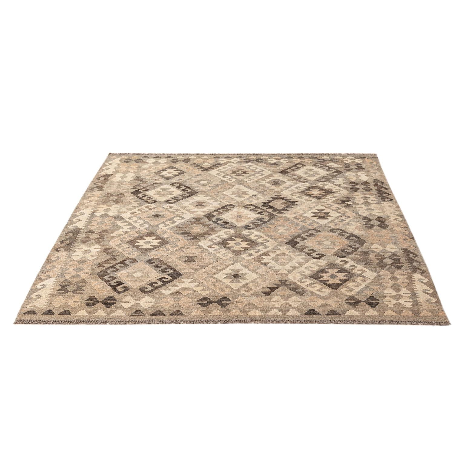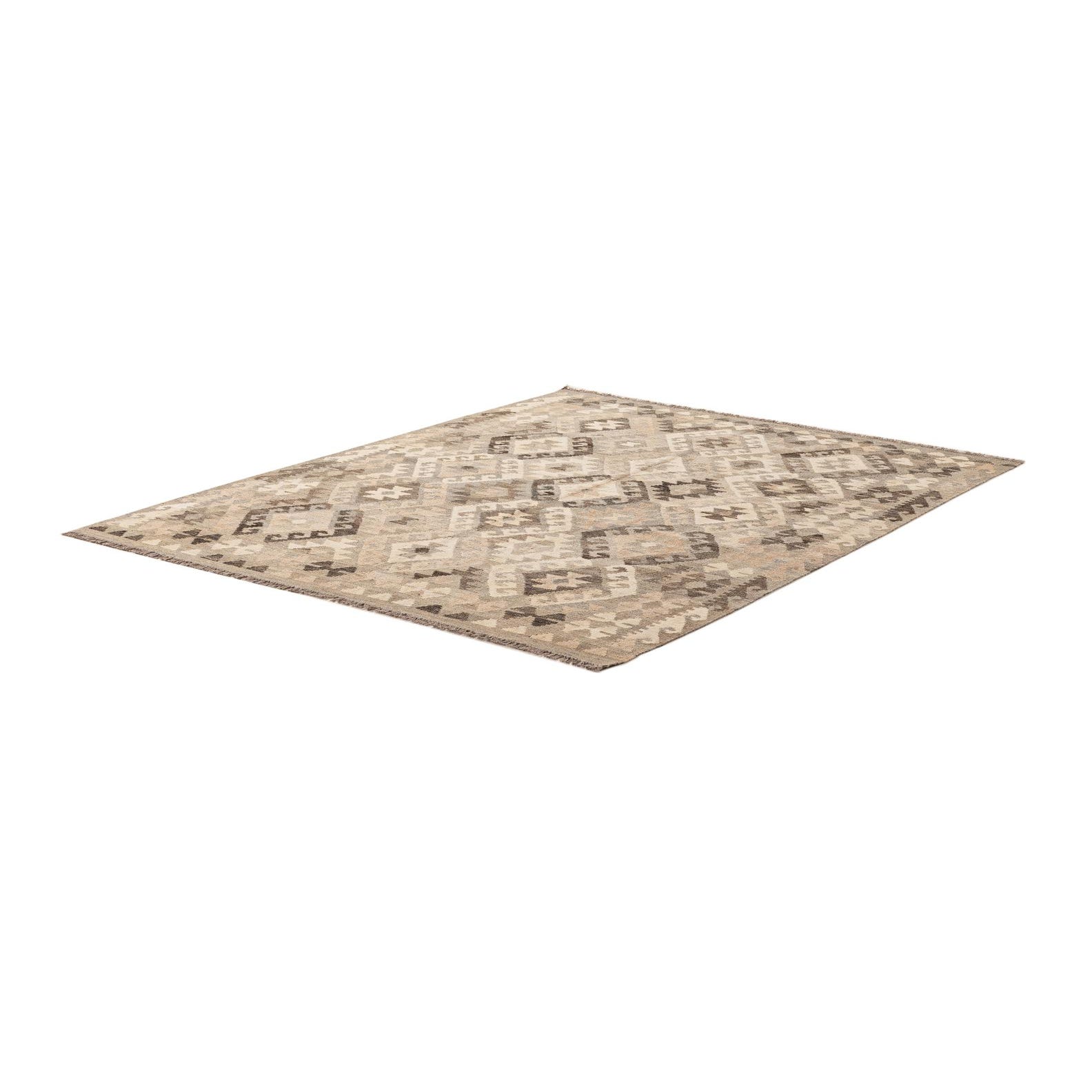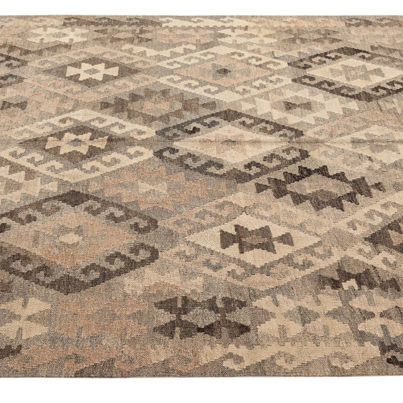 A 5x7 rectangular Kilim Maymana rug featuring a multi-colored tribal diamond pattern in shades of brown, beige, and gray.
