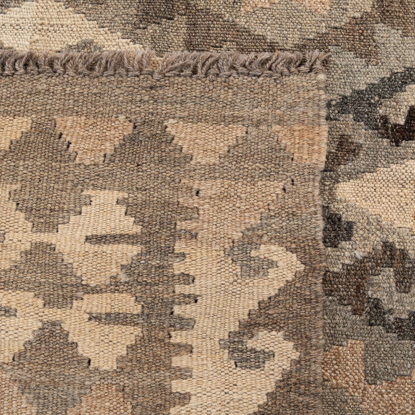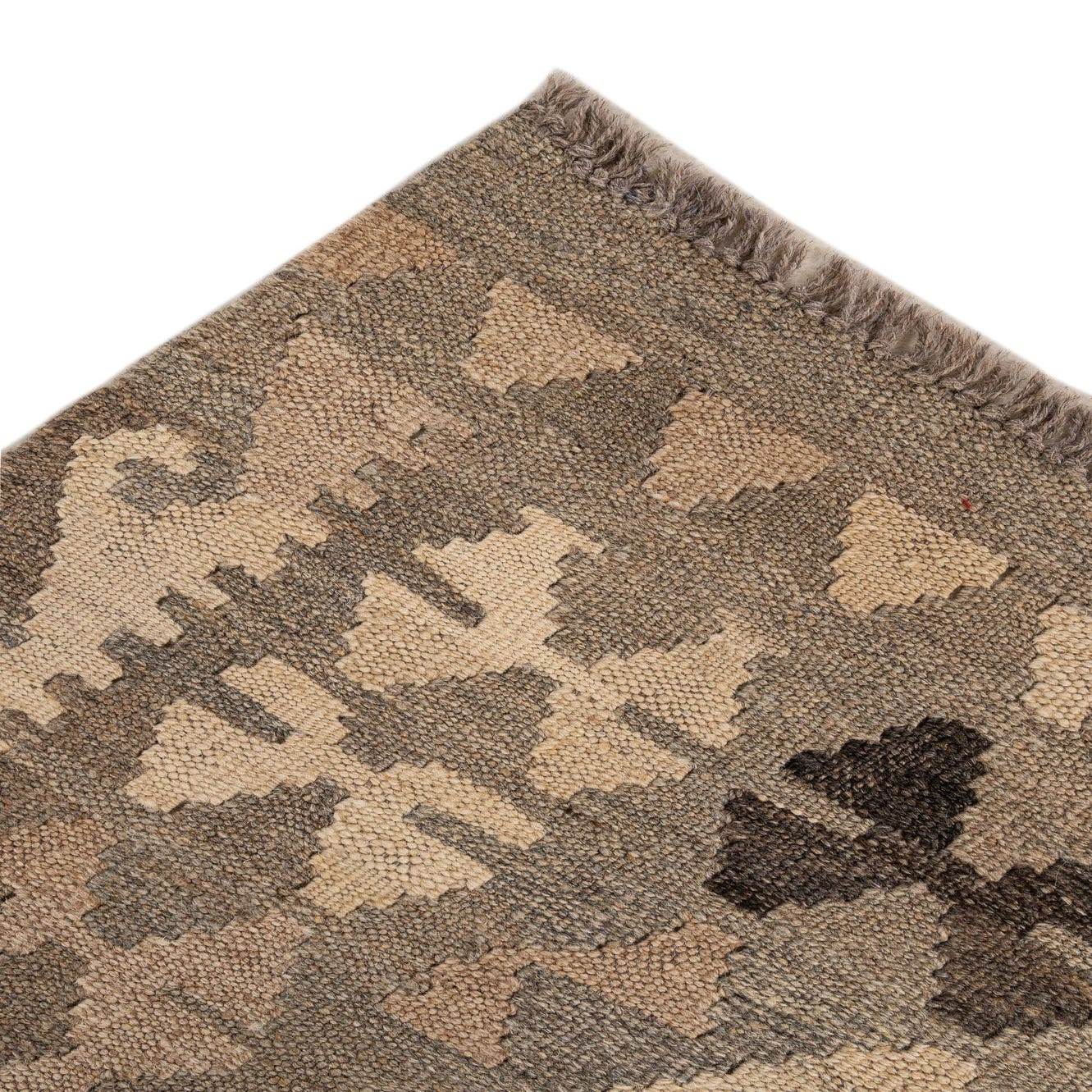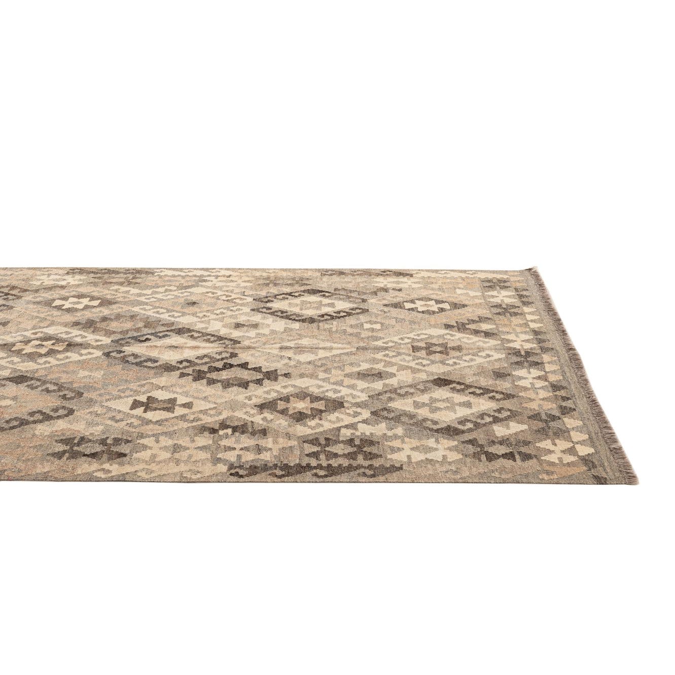 Hand woven of 100% wool, this flatwoven rug displays a sequence of diamond medallions and stepped tribal motifs in a warm, neutral palette. The multi background weaves beige, brown, gray and cream together to create soft color transitions and subtle contrast between the geometric shapes. The surface is firm and low-profile to the touch, with a tight weave that gives clear definition to each motif and a short fringe along the rug’s ends for a finished look.