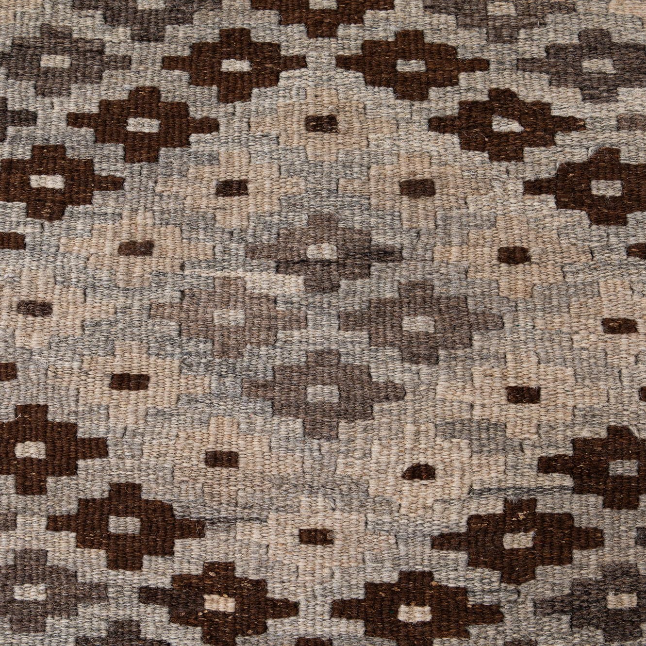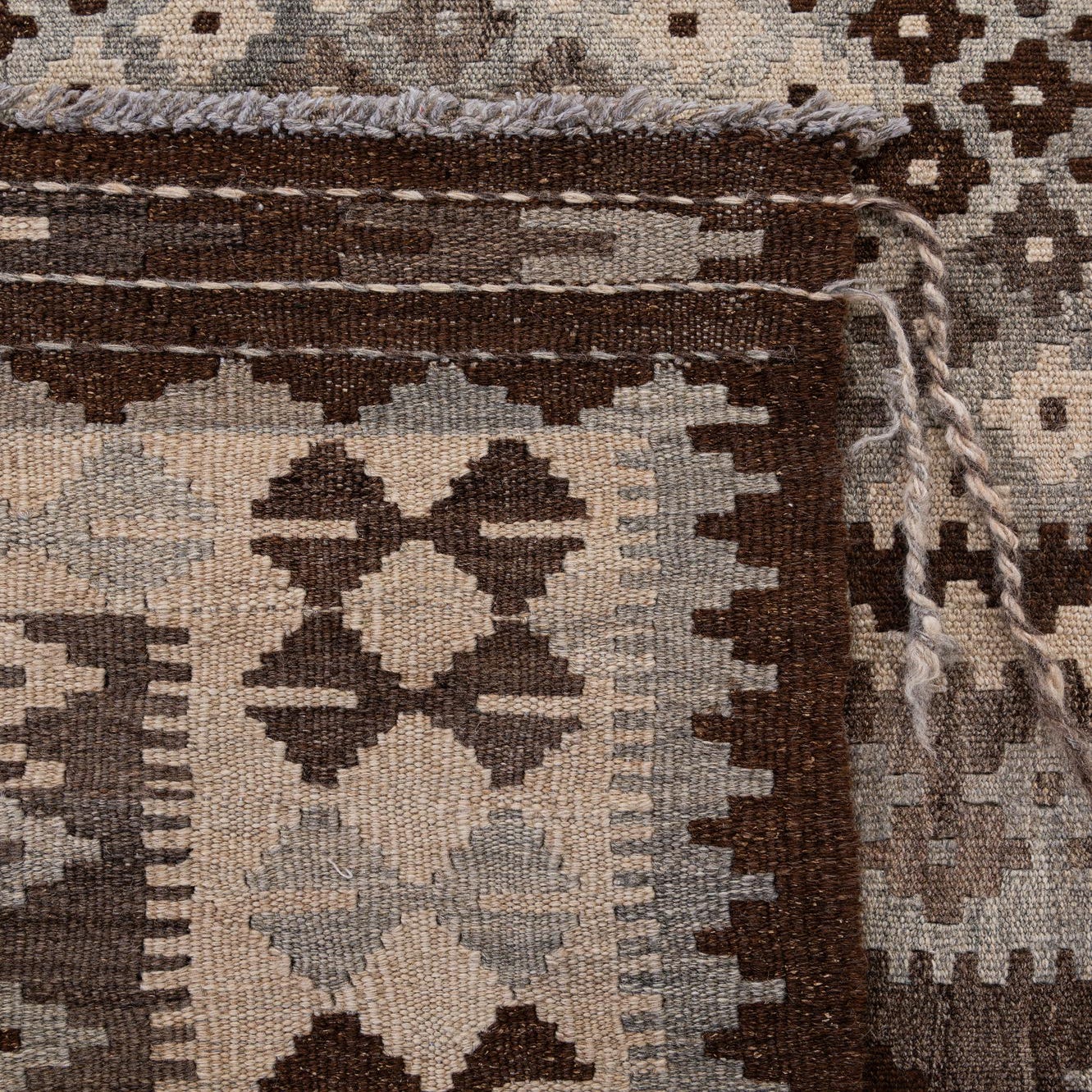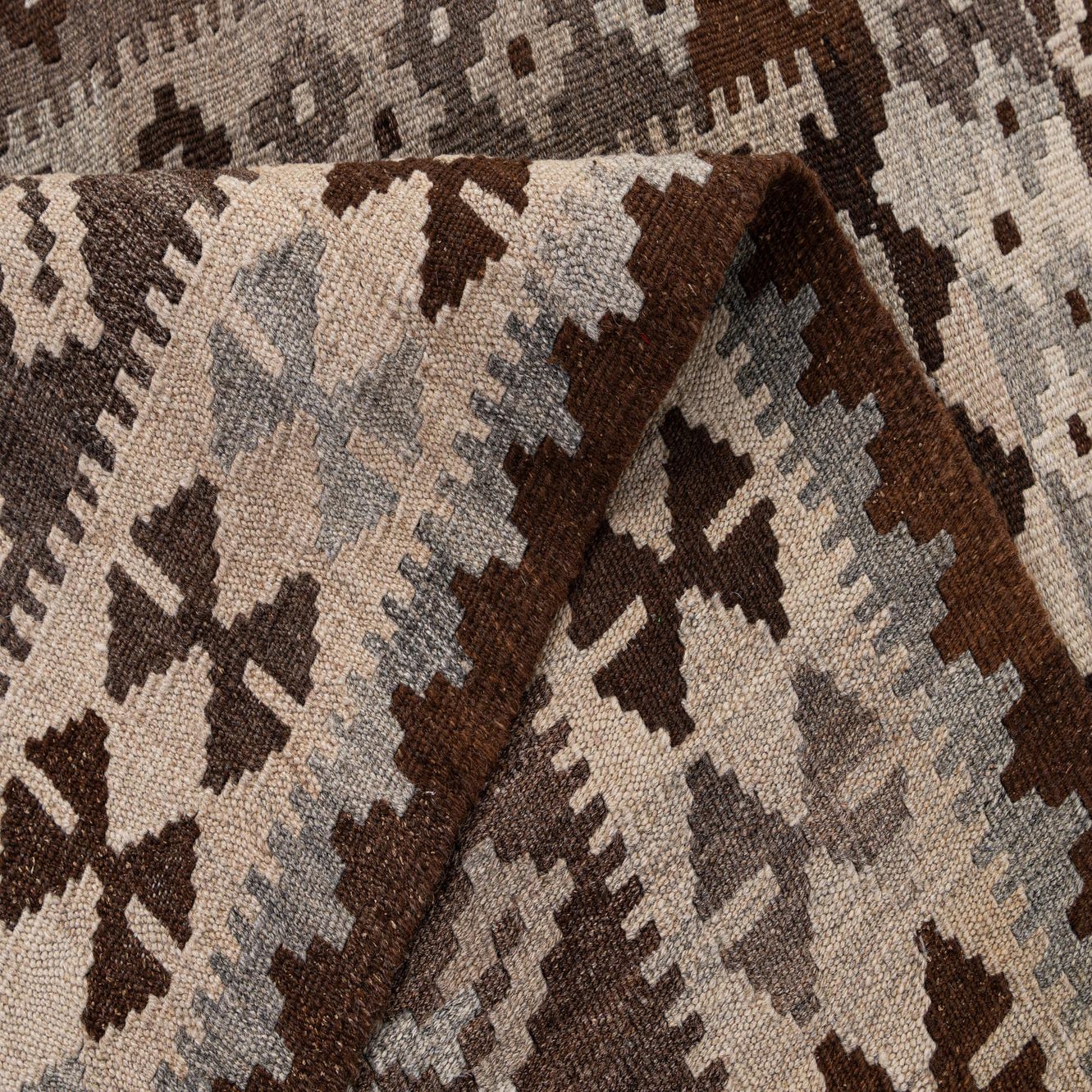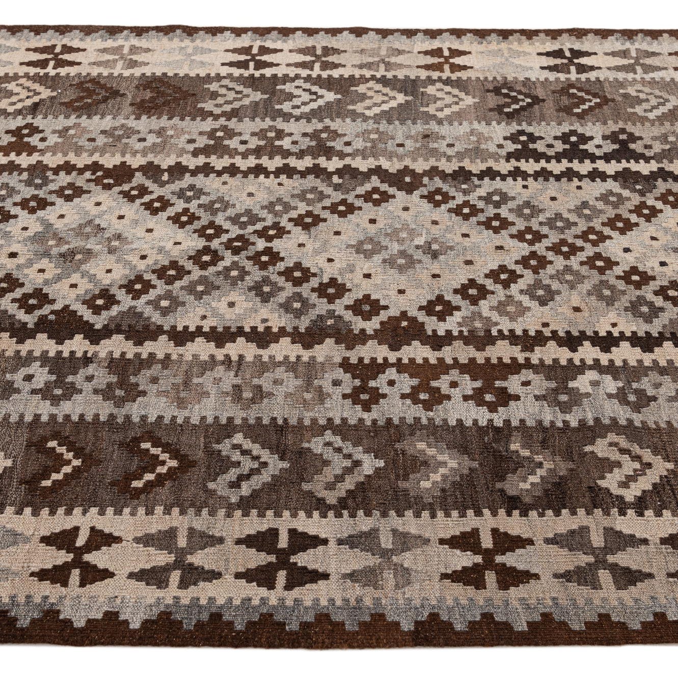 A 5x7 rectangular Kilim Maymana rug featuring a multi-colored tribal pattern with geometric shapes in shades of brown, beige, and grey.