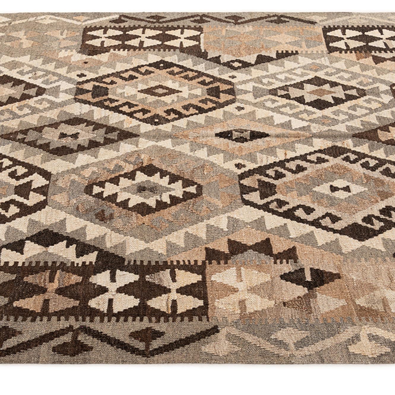 A 5x7 rectangular Kilim Maymana wool rug featuring a multi-colored tribal pattern with diamonds and geometric shapes in shades of brown, beige, and grey.