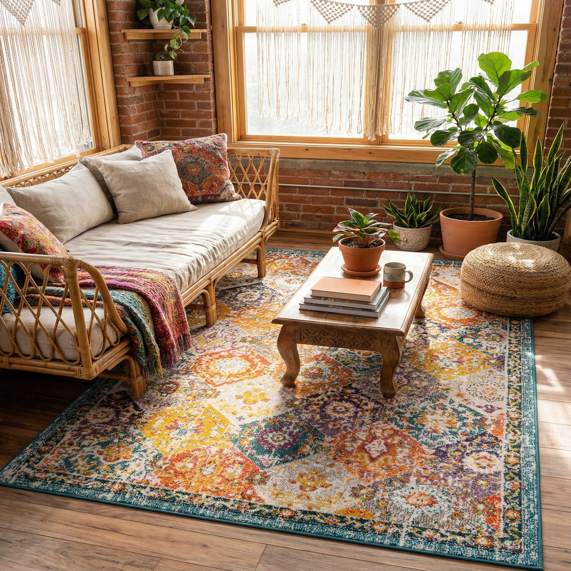 A vibrant 5x7 multi-colored rectangular rug with a distressed medallion pattern and a teal border, suitable for an indoor space.