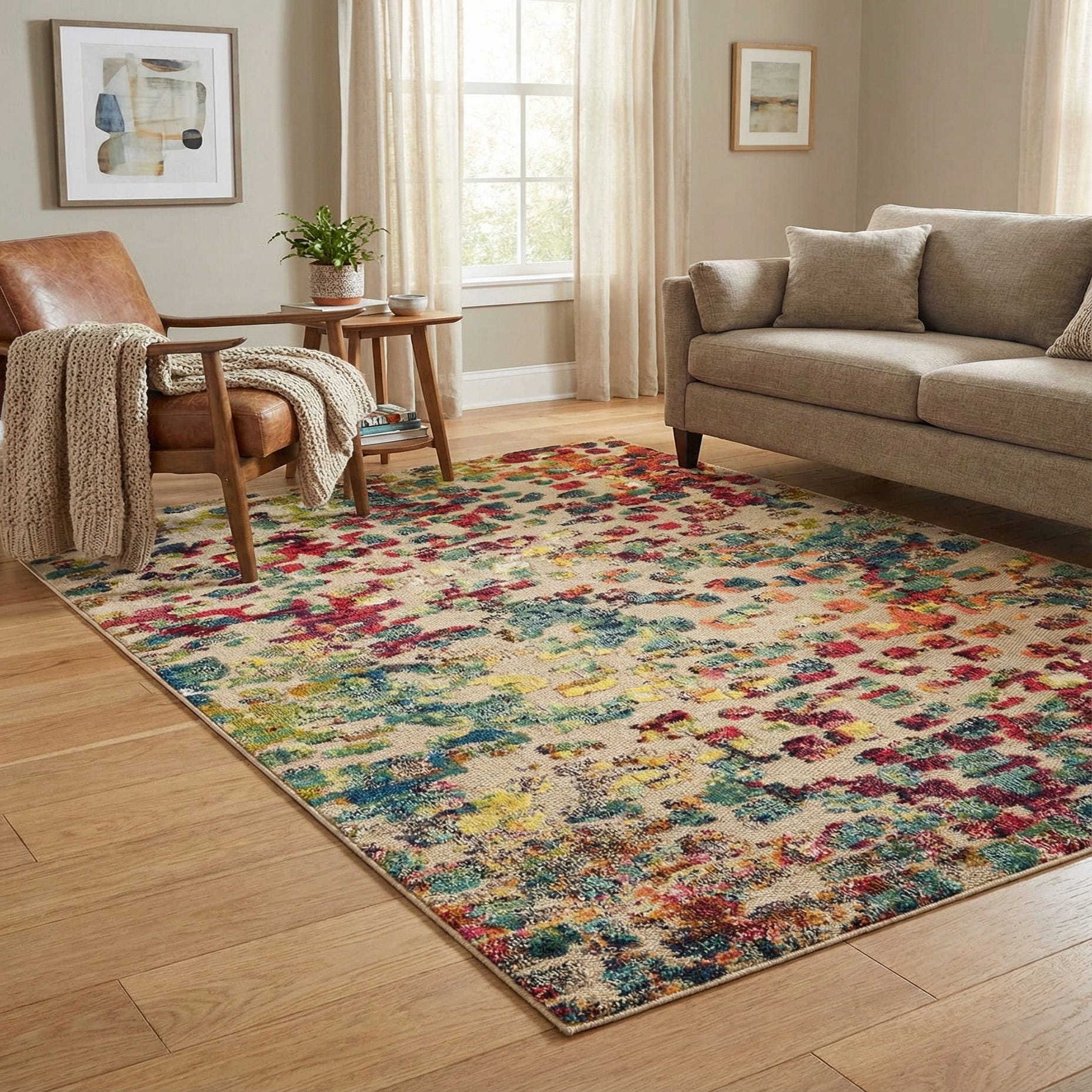 A 5x7 rectangular multi-colored modern rug with a textured pile, featuring abstract blocks of red, blue, green, and yellow on a beige background.