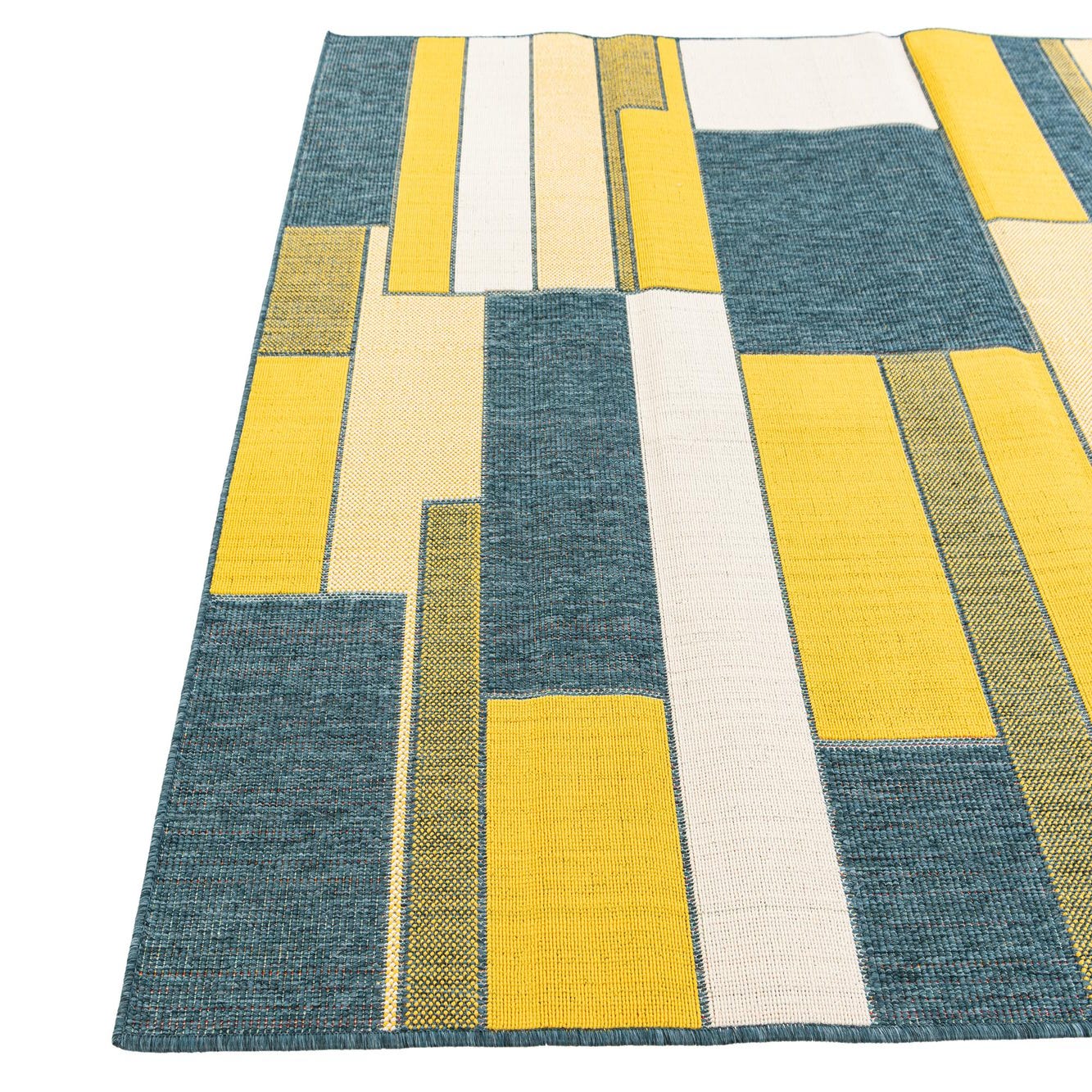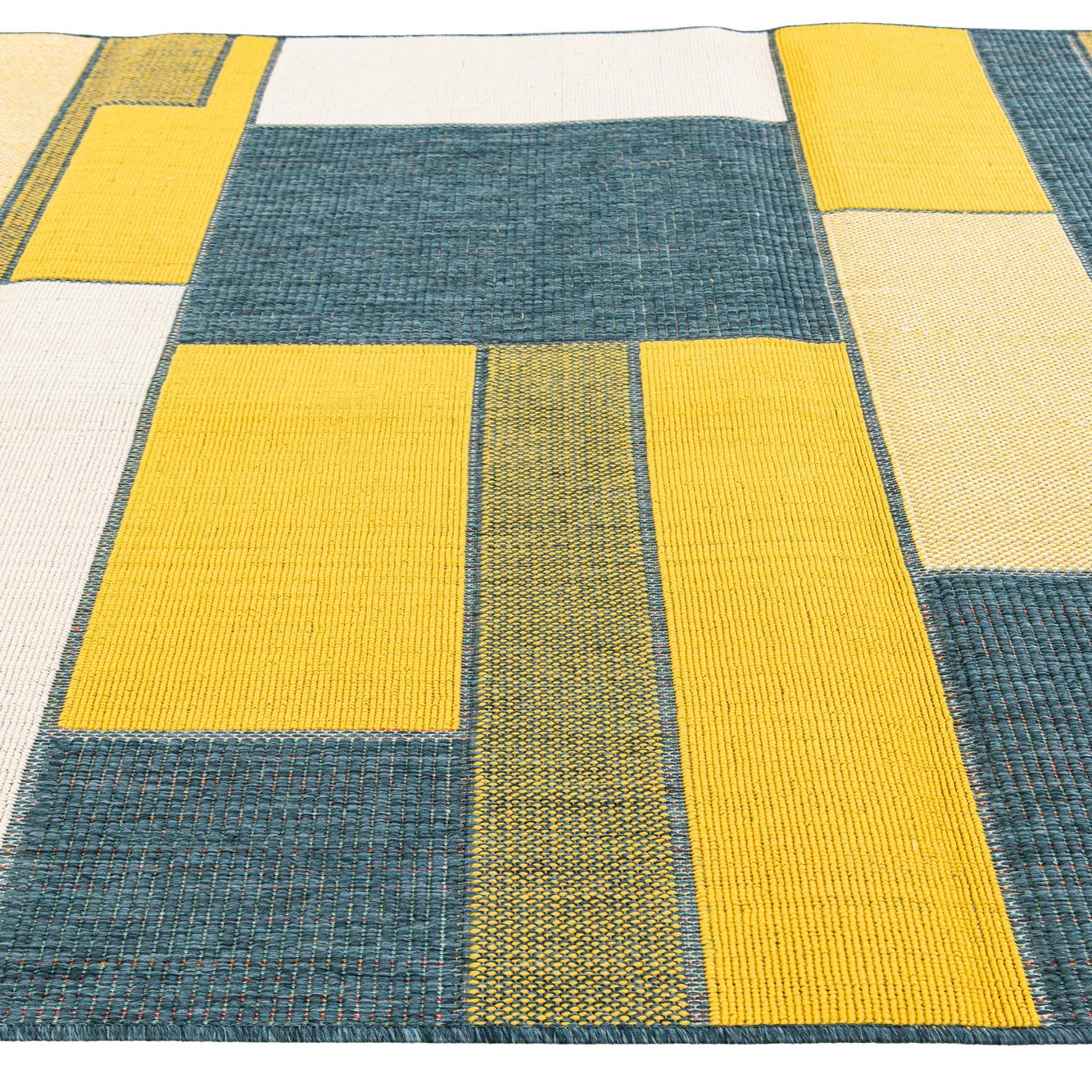 A modern geometric composition of stacked rectangles and linear bands gives this rug a clean, architectural feel. Machine made from 100% polypropylene, the weave produces a low-profile, flat surface that is smooth to the touch with a subtle crosshatch texture where the yarns intersect. The multi background anchors bold fields of navy blue and bright yellow, while ivory panels and muted olive accents add contrast and balance. Running your hand across the surface confirms a firm, tightly woven finish that reads crisp and intentional.