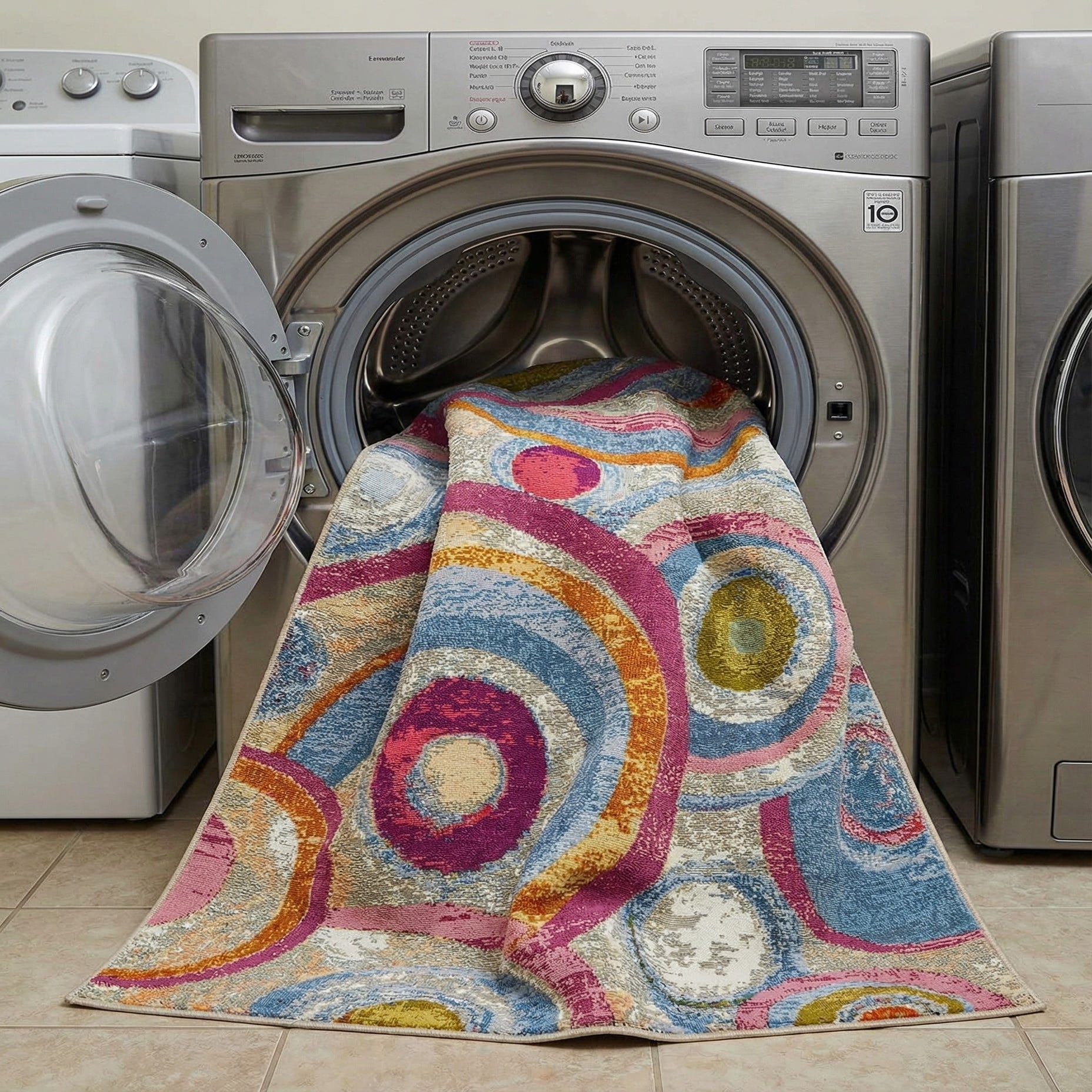 A 5x7 multi-colored modern abstract rug with overlapping circles in blue, pink, orange, and green tones, suitable for indoor or outdoor use.