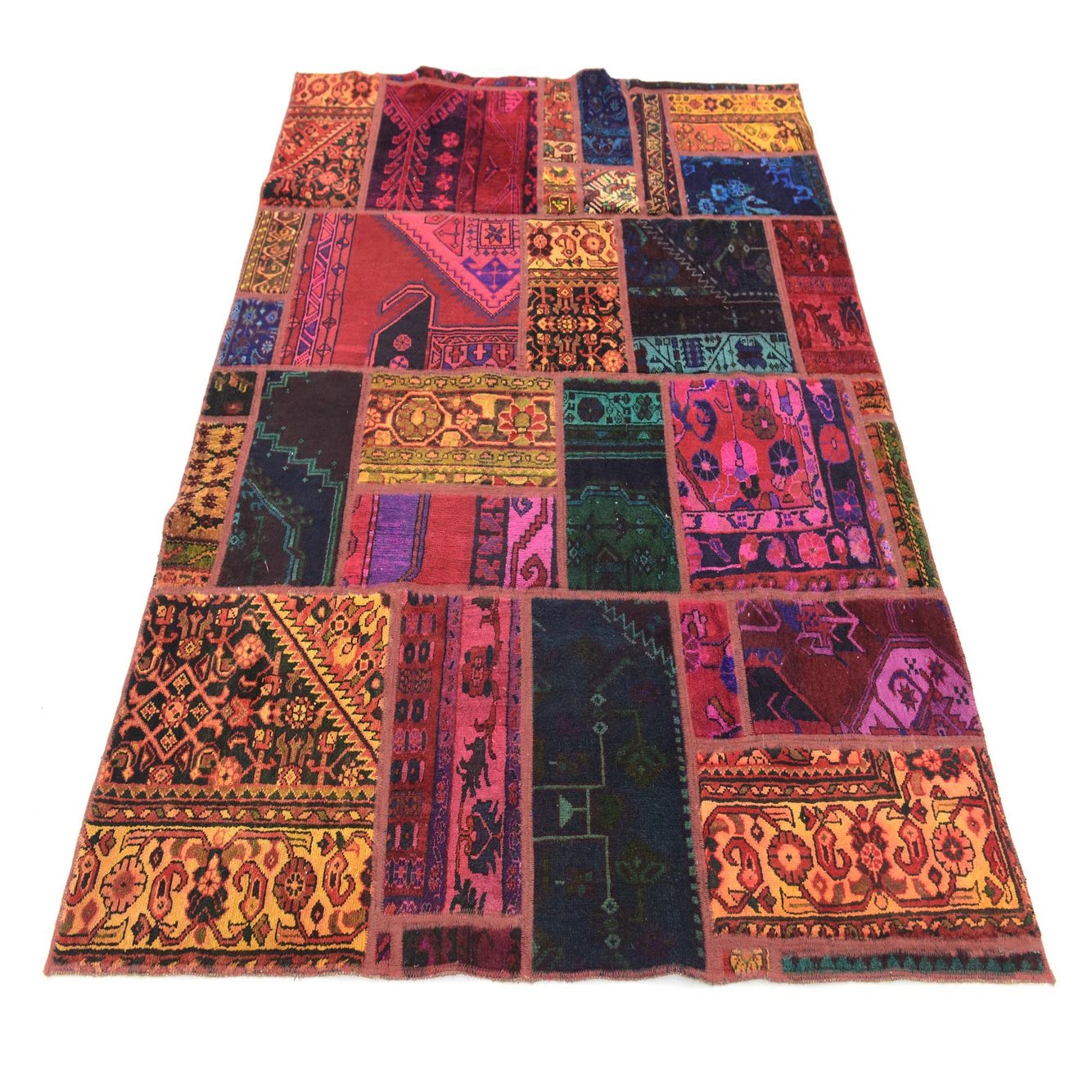 The rug's pattern includes a mix of geometric shapes, floral designs, and intricate borders, creating a quilt-like composition that is both eye-catching and sophisticated. Due to its antique nature, it carries a sense of history and character that can enrich any living space.