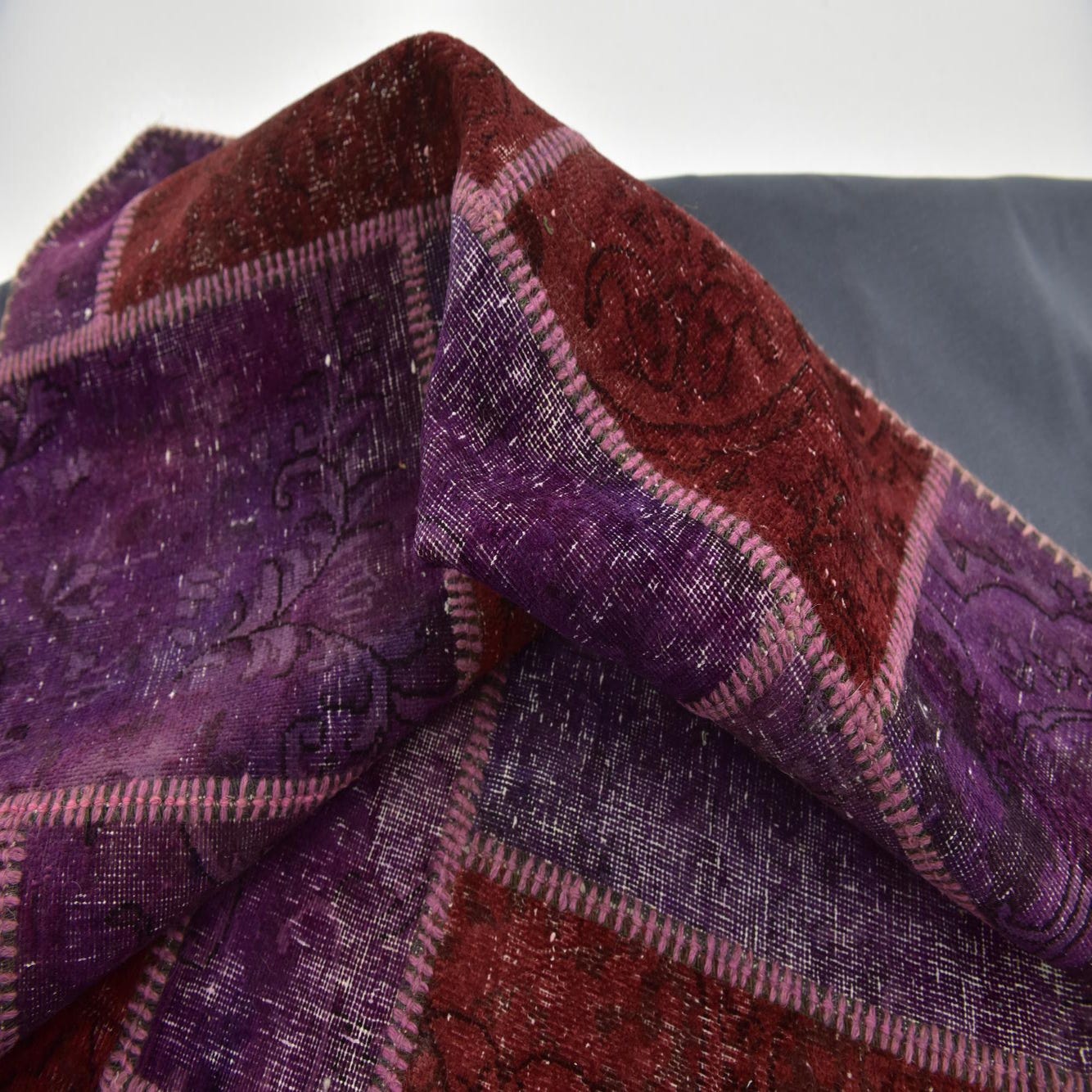 A 5x7 rectangular multi-colored wool rug featuring a patchwork design of purple and red distressed Persian patterns.