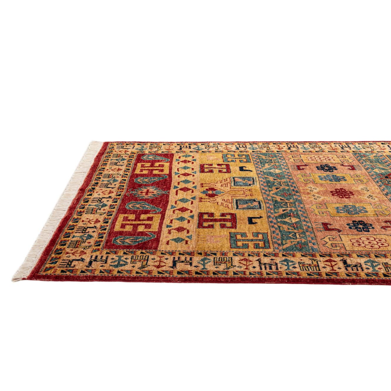 A 5x7 rectangular multi-colored wool rug with a modern oriental pattern, featuring geometric shapes and stylized animal motifs in red, gold, and teal.
