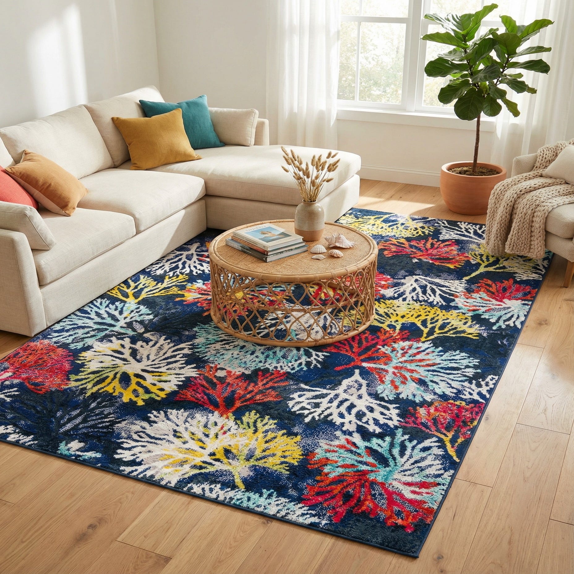 A lively, organic pattern of coral-like motifs spreads across a multi-hued background, bringing an energetic, coastal-inspired look to any room. Colors include navy blue and light blue accents alongside pops of red, yellow, pink, green, ivory, gray and black, layered to create depth and contrast. Machine-made from 70% polypropylene and 30% polyester, the rug has a consistent low pile with a soft hand and a subtle sheen that highlights the pattern’s fine edges and color transitions. Background color is Multi.