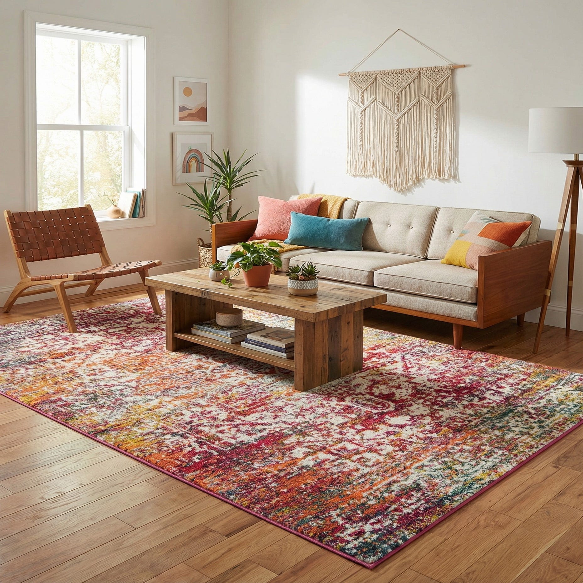 Primary color is Multi. Colors in this rug include: Multi, Black, Gray, Ivory, Orange, Red, Yellow.