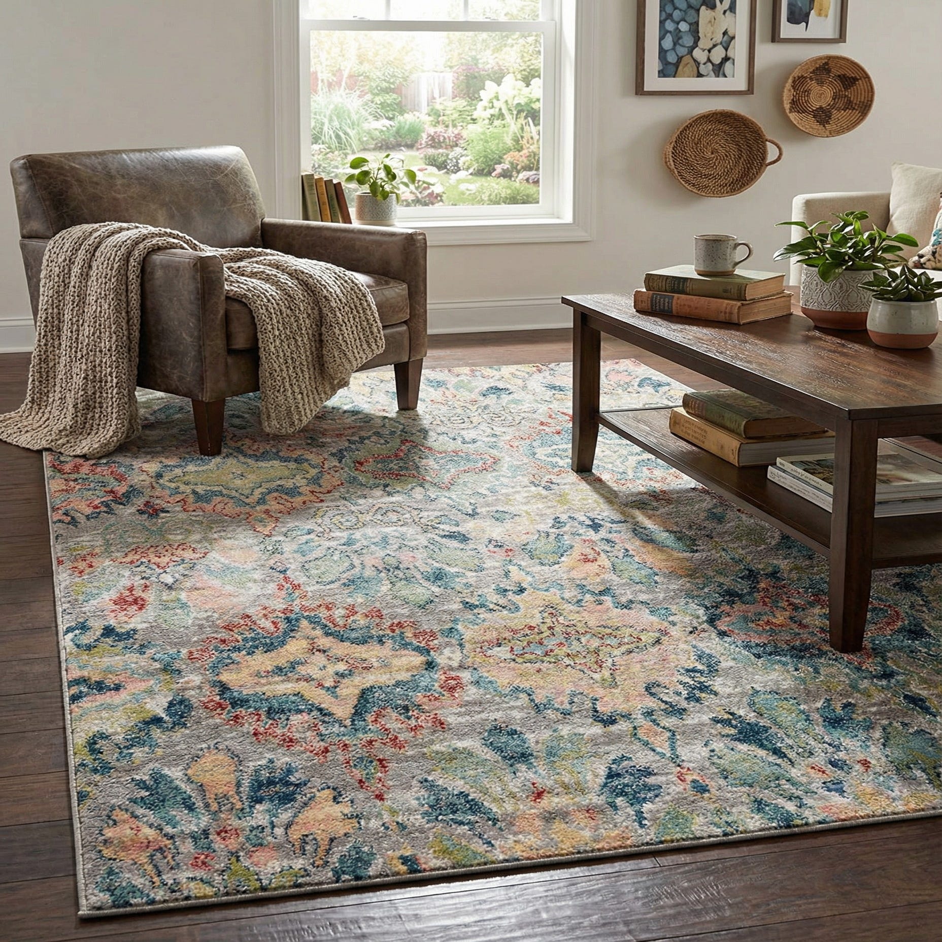 Machine made of 100% polypropylene, the rug has a low-to-medium pile that feels pleasantly springy underfoot with a subtle, soft sheen. It works well as an anchor in a living room beneath a neutral sofa and navy pillows, layered at the foot of a bed with natural wood furniture and linen bedding, or placed under a dining table to add pattern without overwhelming the space. The color mix also complements coastal and cottage palettes as easily as it does more contemporary or bohemian schemes.