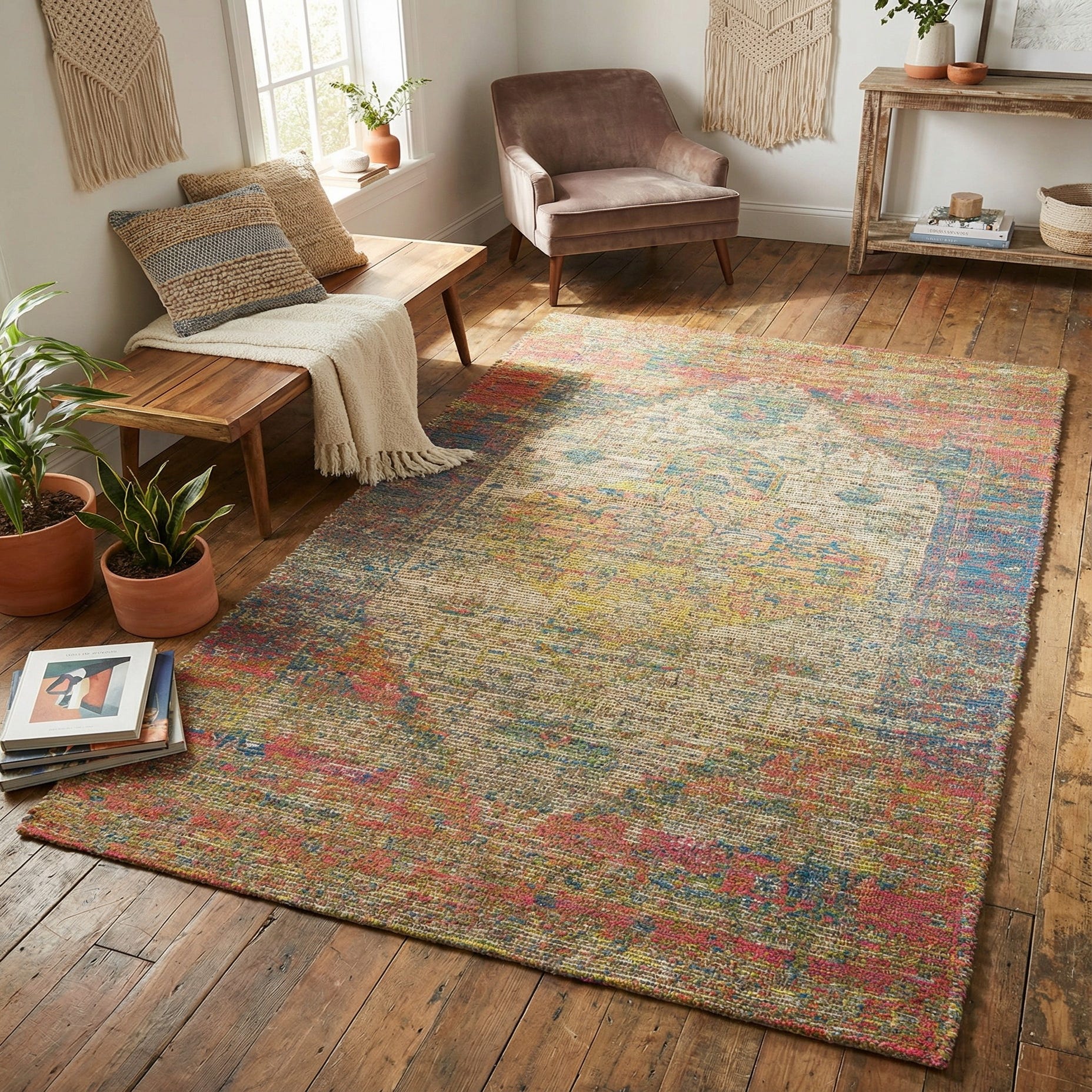 The lively, vintage-inspired palette pairs well with relaxed, layered interiors. Place it beneath a low coffee table to add color and depth to a casual living room, tuck it into a sun-filled reading nook with woven baskets and linen upholstery, or use it under a natural-wood dining table to introduce pattern without overwhelming the room. It also works as a layering piece over a larger neutral foundation, and complements boho-transitional or modern eclectic schemes that mix natural materials and soft, muted color.