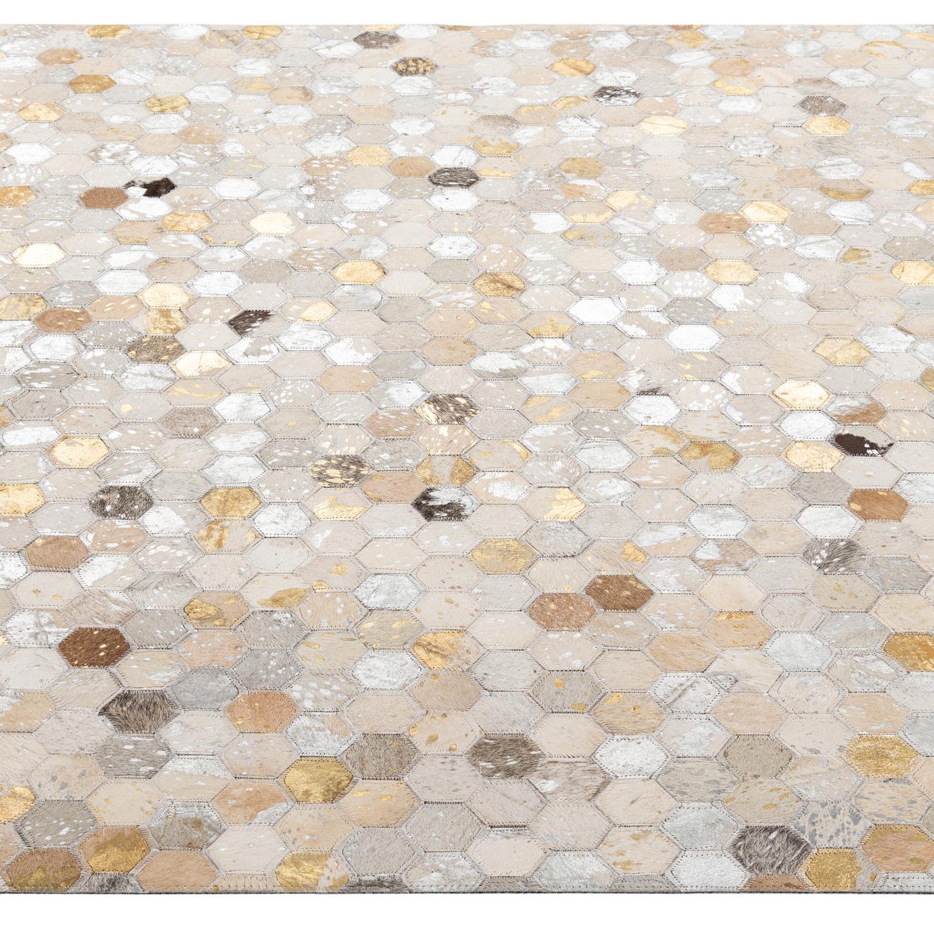 A precise honeycomb of small hexagonal patches creates a geometric patchwork across a multi-colored ground. Individual tiles show natural cowhide markings alongside metallic-finish panels in gold and silver, with a palette of beige, ivory, gray, brown and occasional black accents. The mix of strict geometry and organic hide variation gives the piece a contemporary, artisanal character that balances pattern with subtle, natural detail.