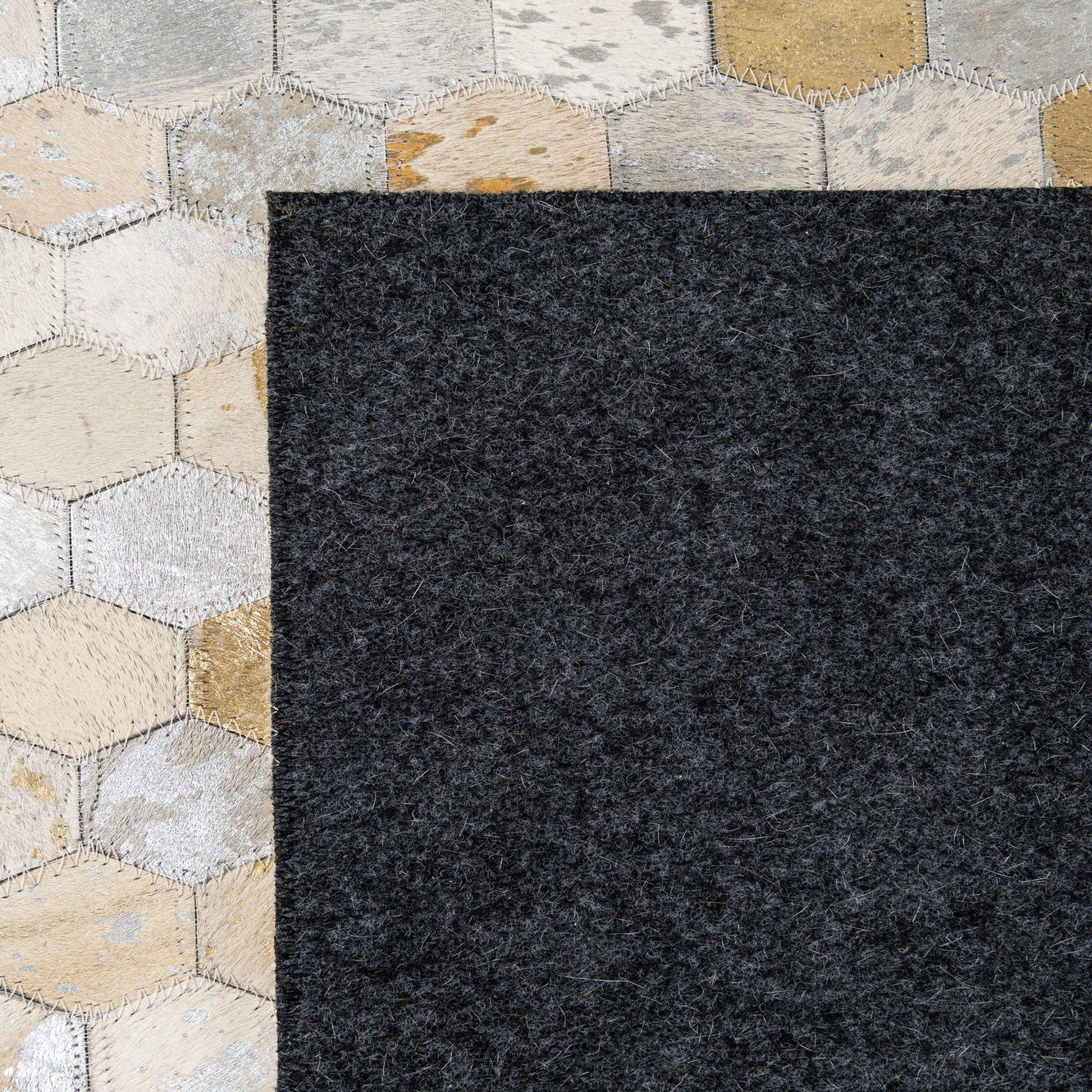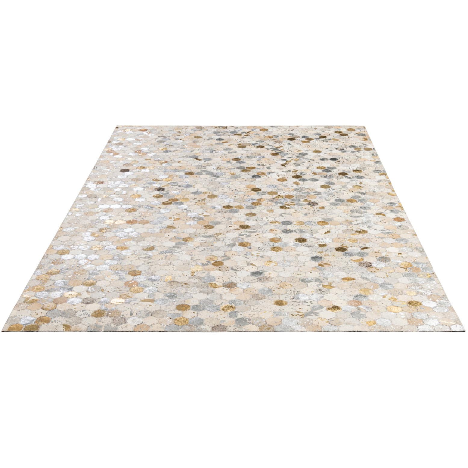 A 5x8 rectangular Cowhide Patchwork rug with a modern hexagonal pattern in multi-colored natural and metallic gold tones.