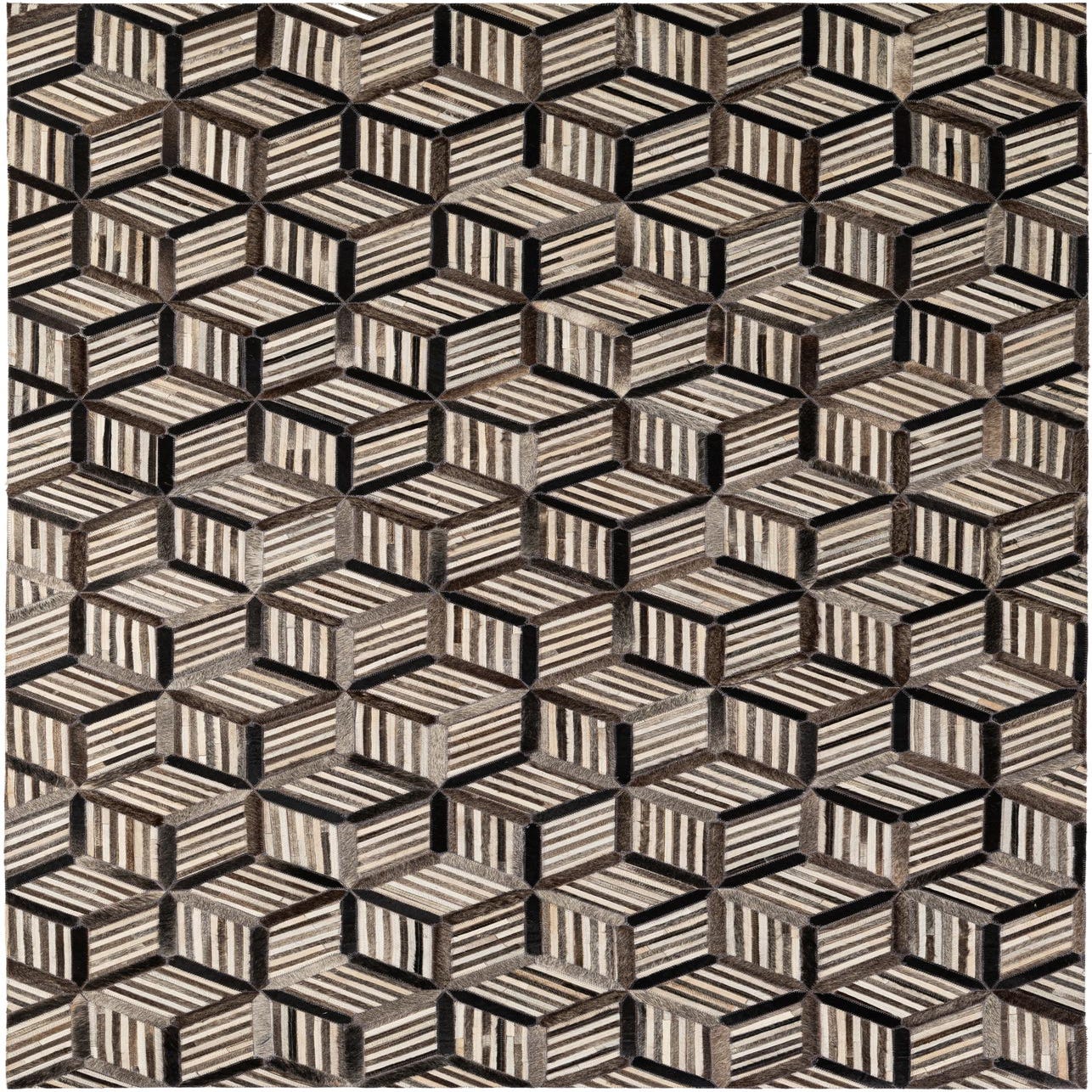 A 5x8 rectangular Cowhide Patchwork rug featuring a modern geometric cube pattern in multi-colored stripes.