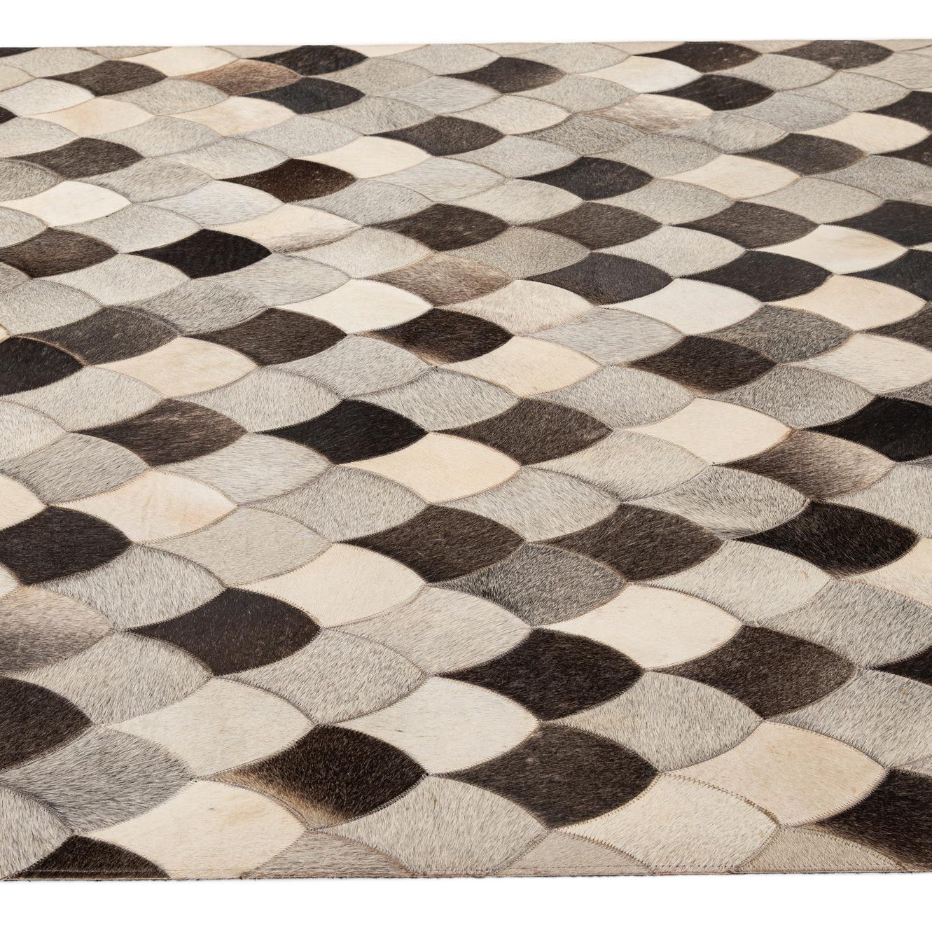 A 5x8 rectangular Cowhide Patchwork rug featuring a modern scalloped pattern in multi-colored natural cowhide and leather.