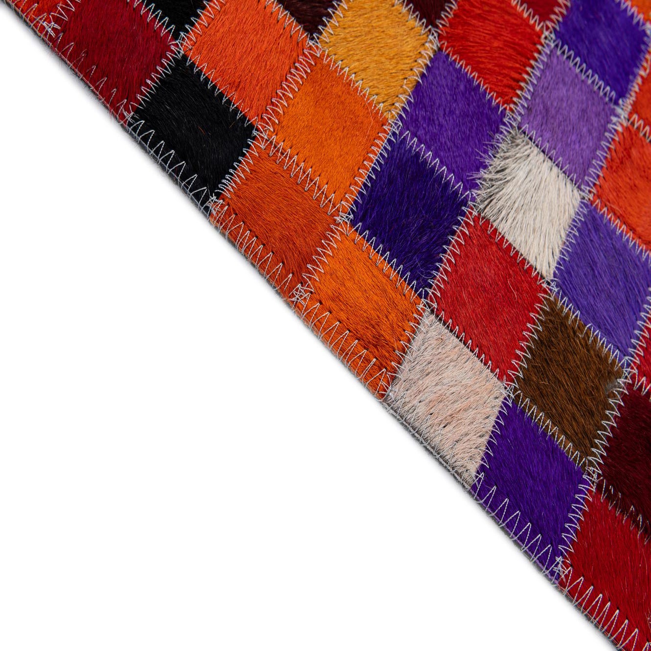 A 5x8 rectangular multi-colored modern patchwork rug made from cowhide and leather, featuring small squares of vibrant orange, purple, red, and cream.