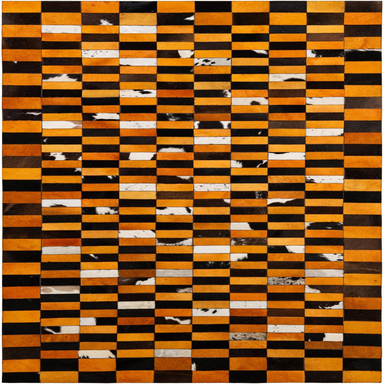 A rectangular 5x8 Cowhide Patchwork rug featuring a modern stripe pattern in multi-colored hues, perfect for a living room.
