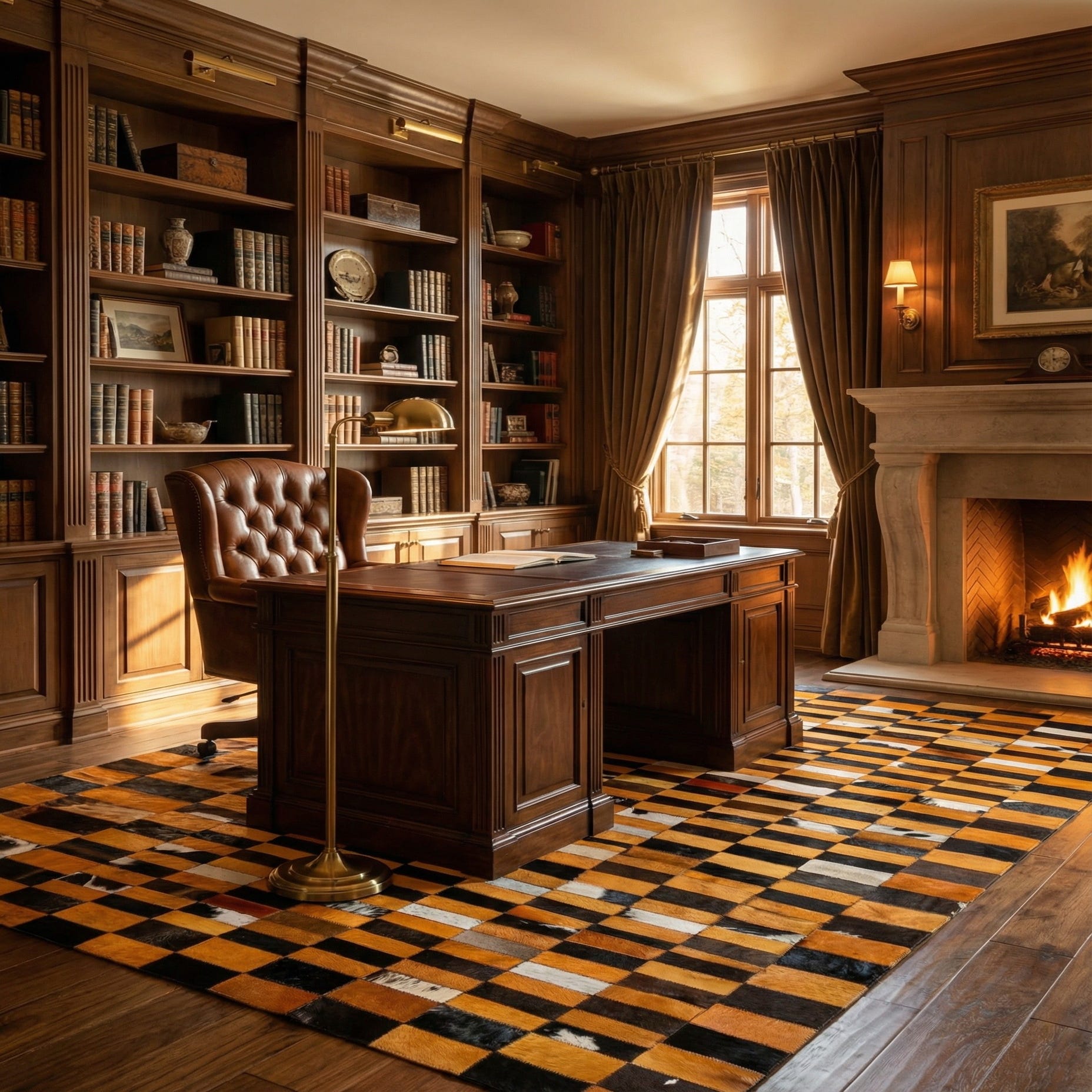 This piece is well-suited to rooms that benefit from warm, grounded color and graphic rhythm—think a mid-century living room with walnut furnishings, a contemporary loft with concrete floors and matte black accents, or an eclectic study layered with woven textiles and plants. Pair it with neutral upholstered seating or leather chairs to let the pattern anchor the space, or use it in a narrow entryway or hallway to add visual movement without overwhelming the room.