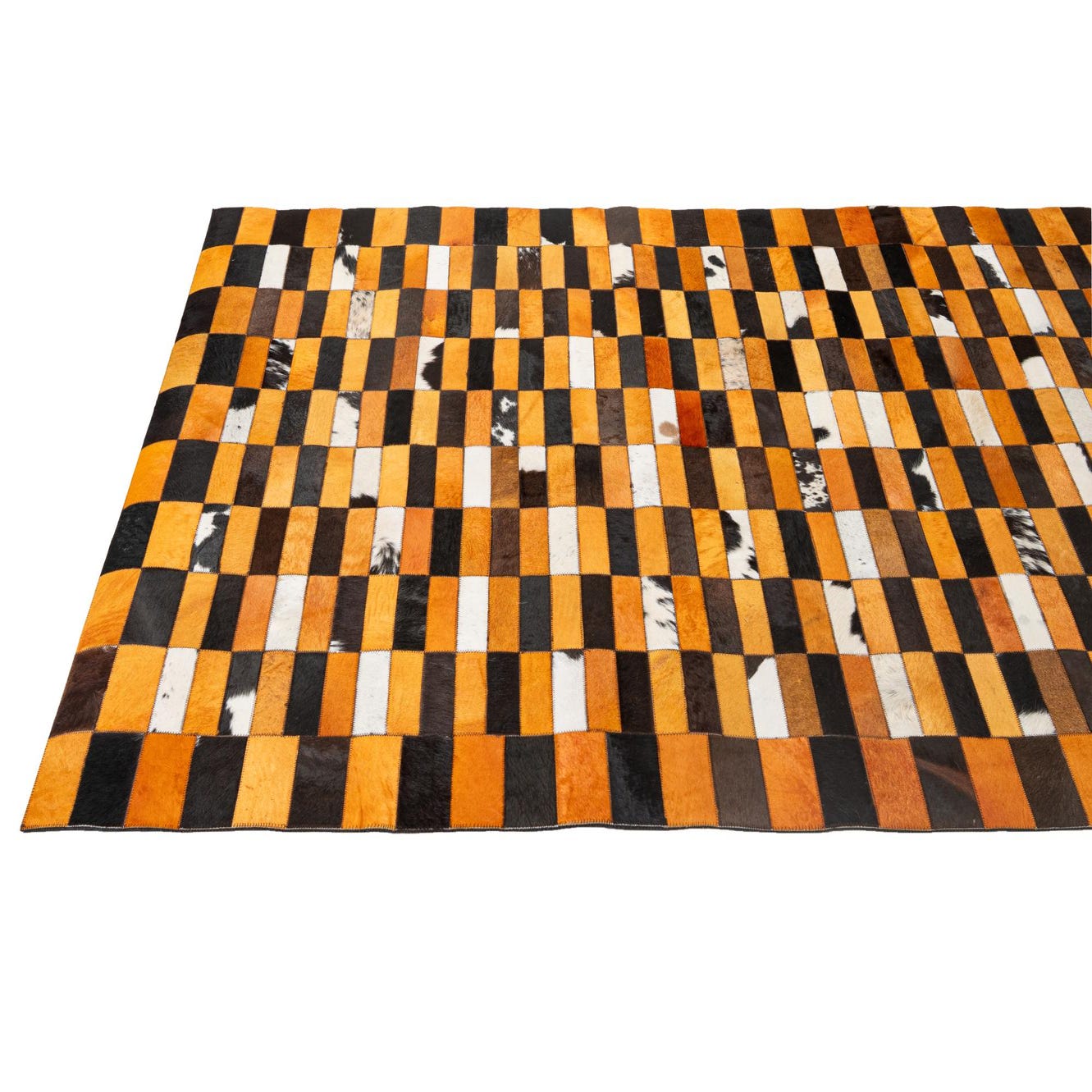 Hand-made from cowhide and leather, this patchwork rug arranges narrow rectangular panels into a tight, checkerboard-like grid. Warm orange and light brown squares alternate with deeper brown and ivory sections, while select patches show natural black-and-white cowhide markings for organic contrast. The surface has the low, tactile nap of hair-on-hide with a subtle leather sheen and visible stitching between panels, giving the rug a crafted, textural presence underfoot.