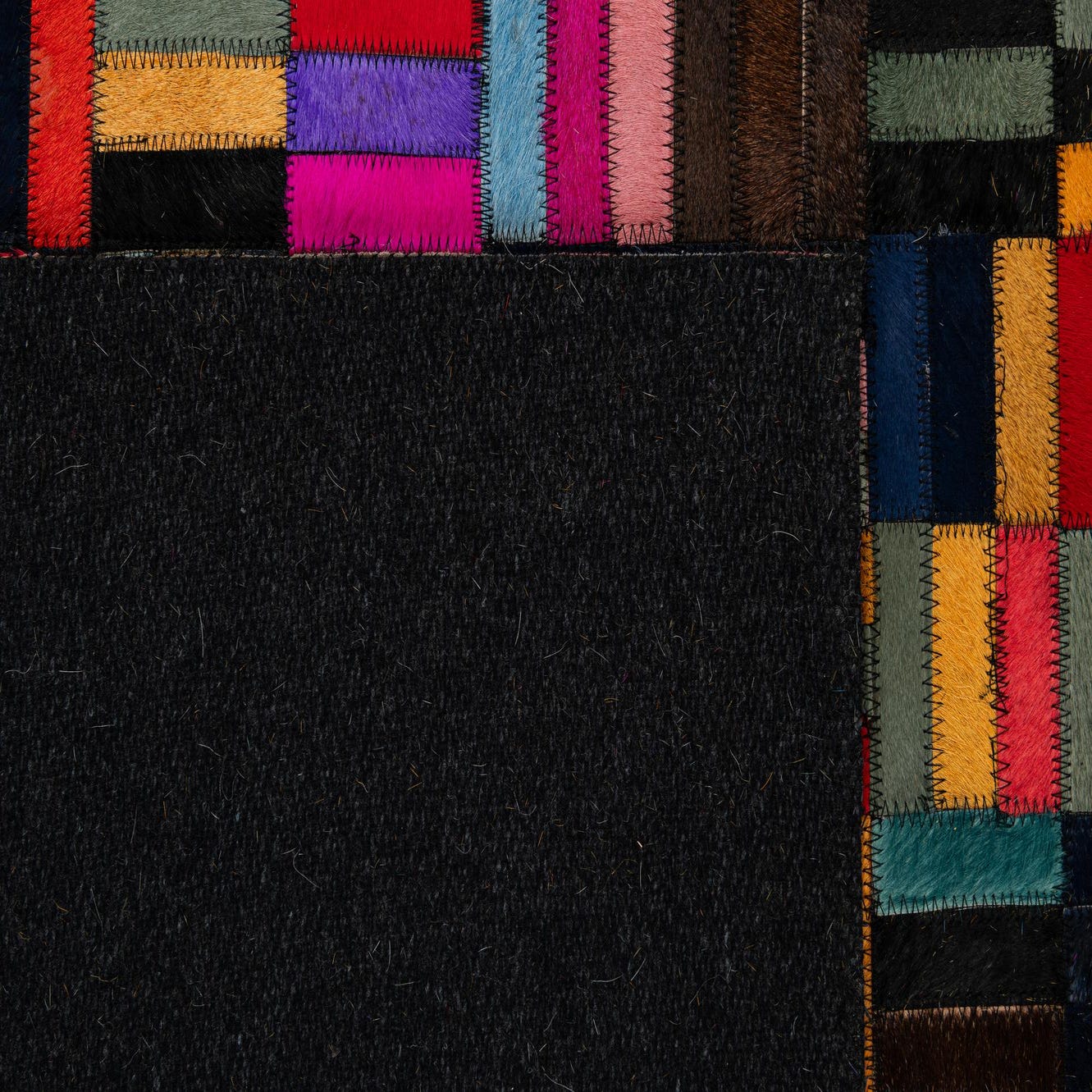 A 5x8 rectangular multi-colored modern patchwork rug made of cowhide and leather, featuring vibrant blocks of fuchsia, orange, blue, red, and black.
