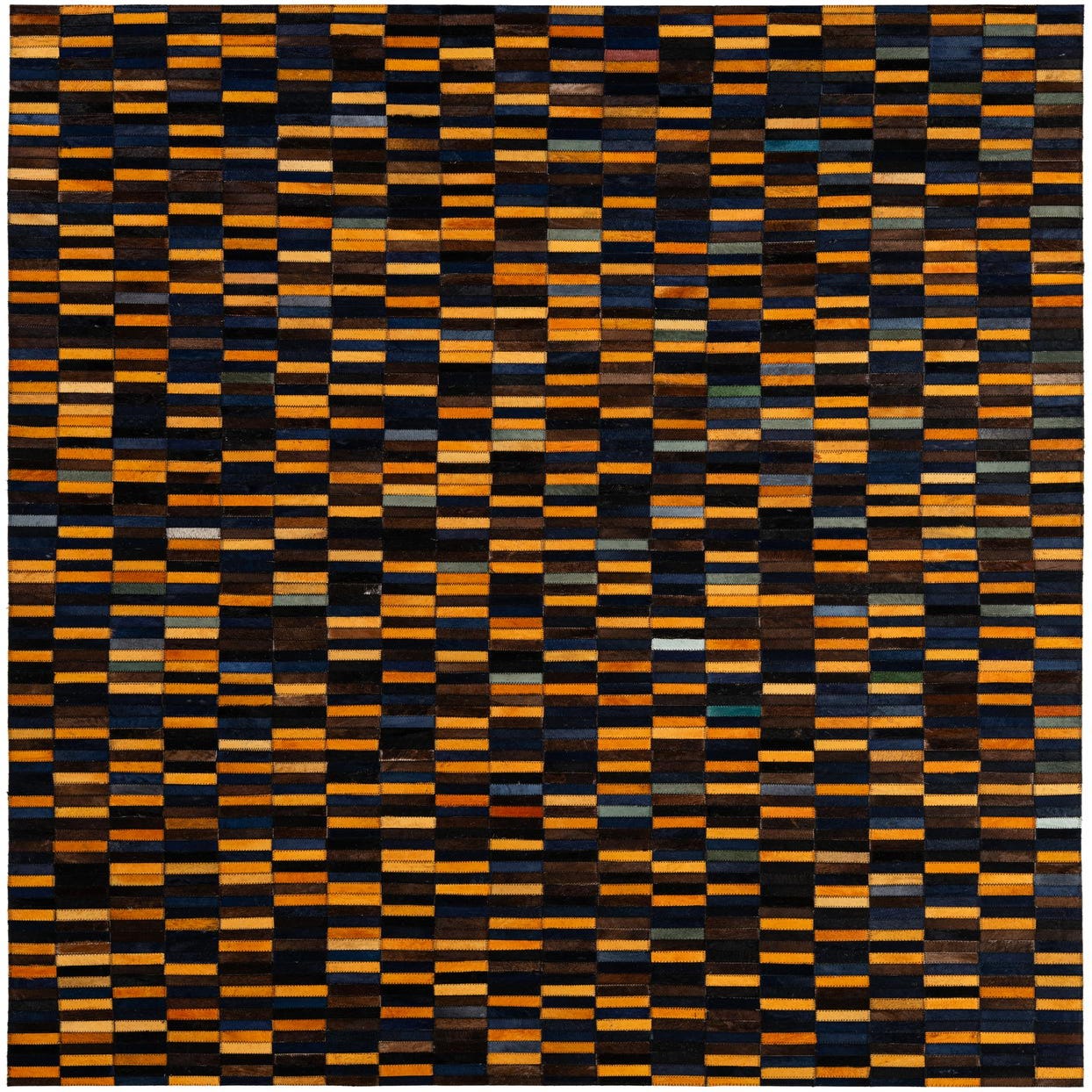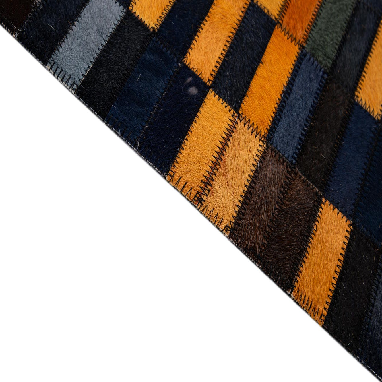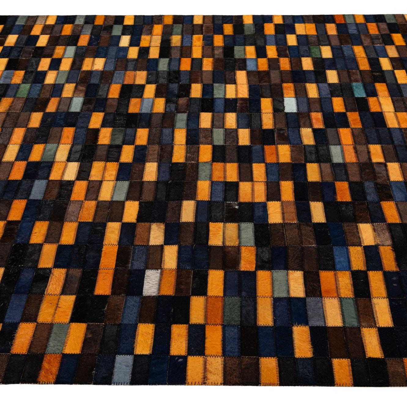 A tight patchwork of small rectangular panels creates a rhythmic, mosaic-like pattern across a multi background. Bands of deep navy, rich brown and black sit alongside warm orange and golden yellow, with occasional gray and muted teal notes that add depth. The hand-sewn seams between each patch form subtle linear texture, and the hair-on-hide surface offers a soft, tactile nap with a natural, low sheen that highlights the leather’s grain.