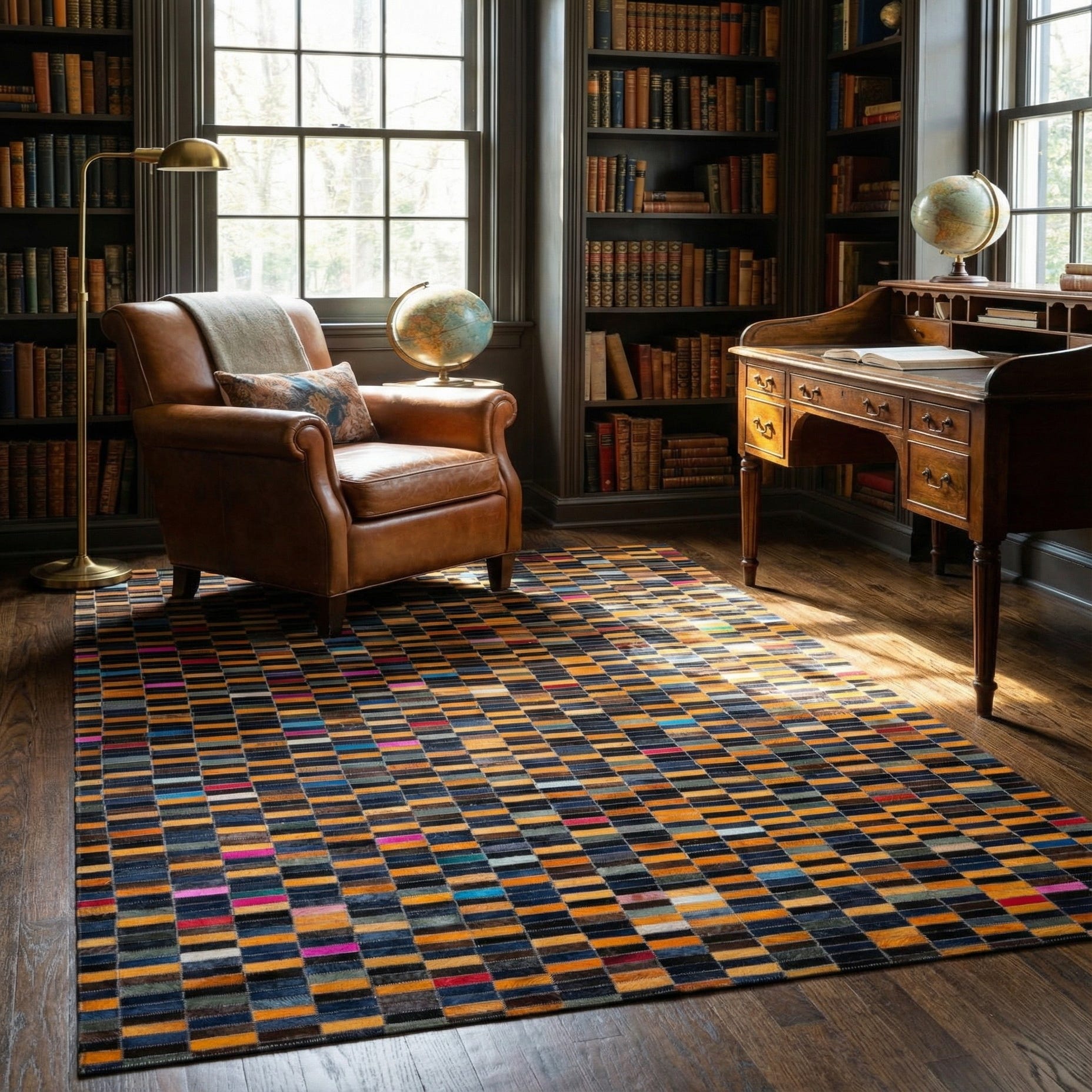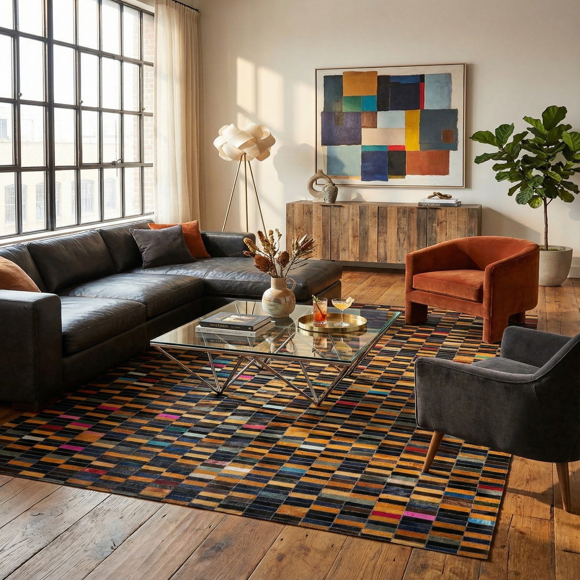 A 5x8 rectangular Cowhide Patchwork rug featuring a modern stripe pattern in multi-colored hues, ideal for a living room or bedroom.