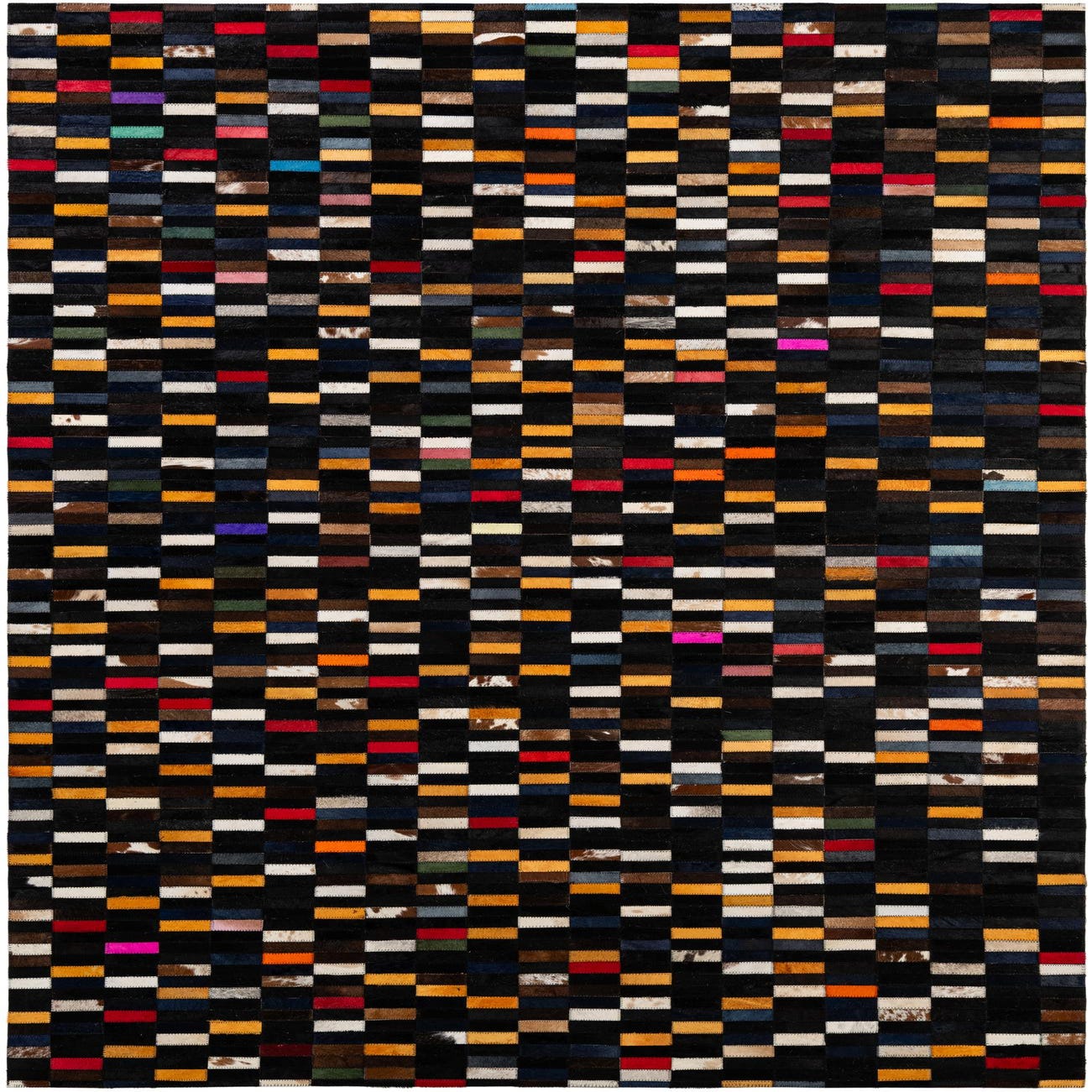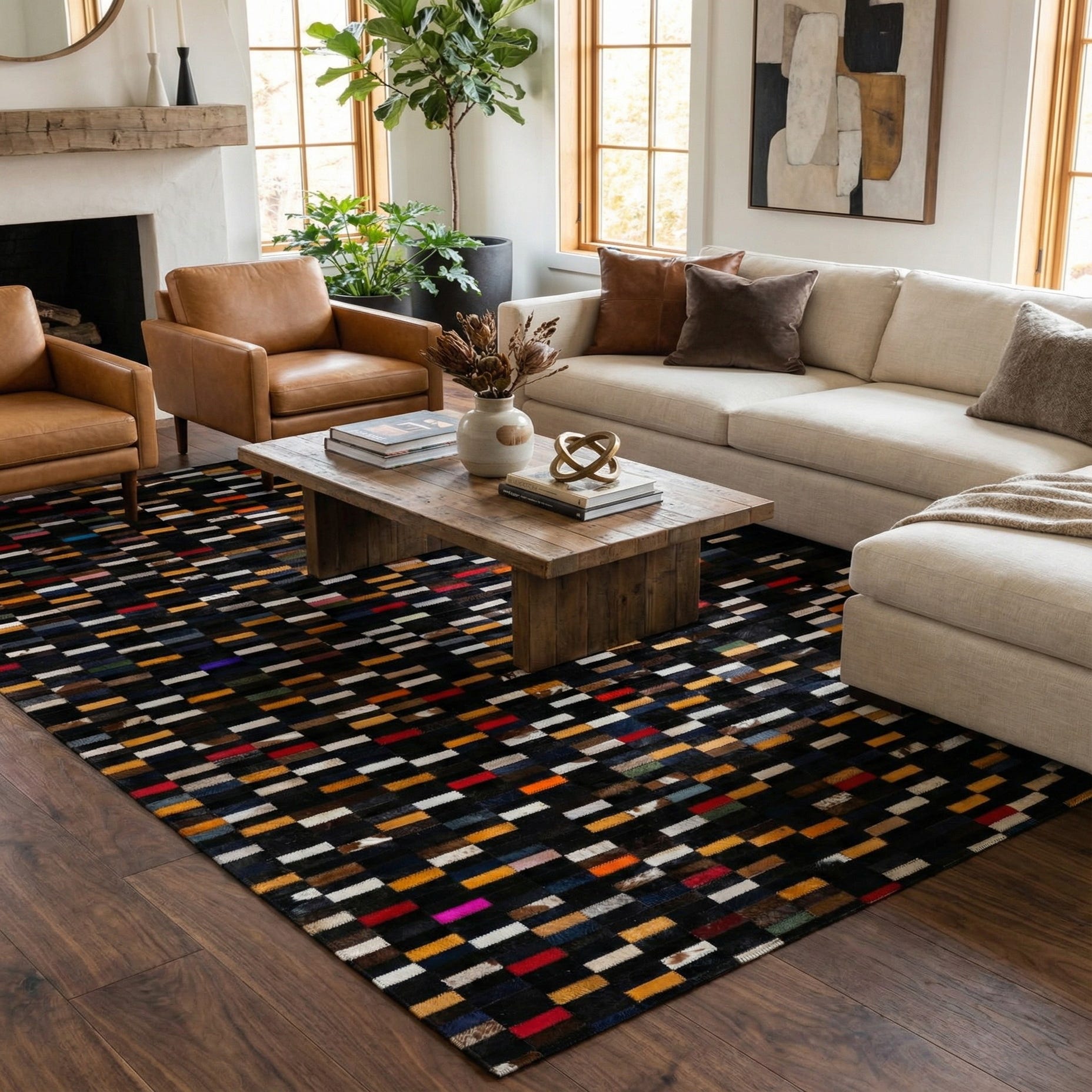 A rectangular 5x8 modern patchwork cowhide rug with multi-colored horizontal stripes on a black background.