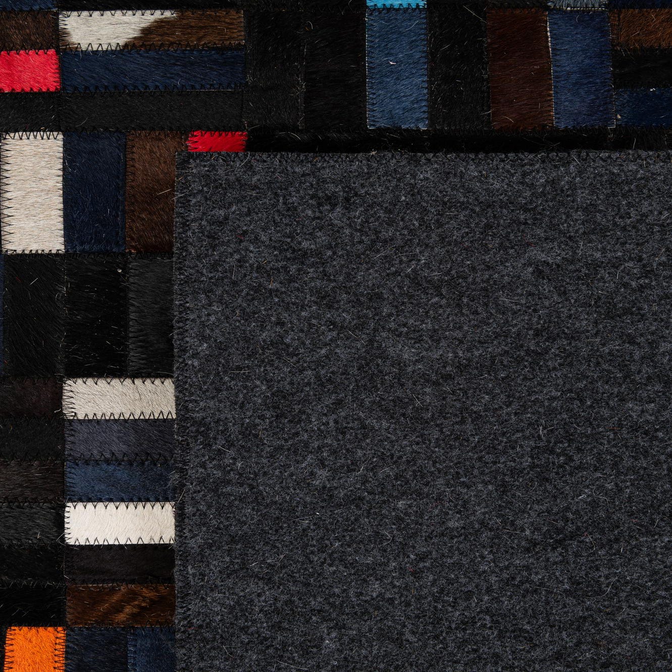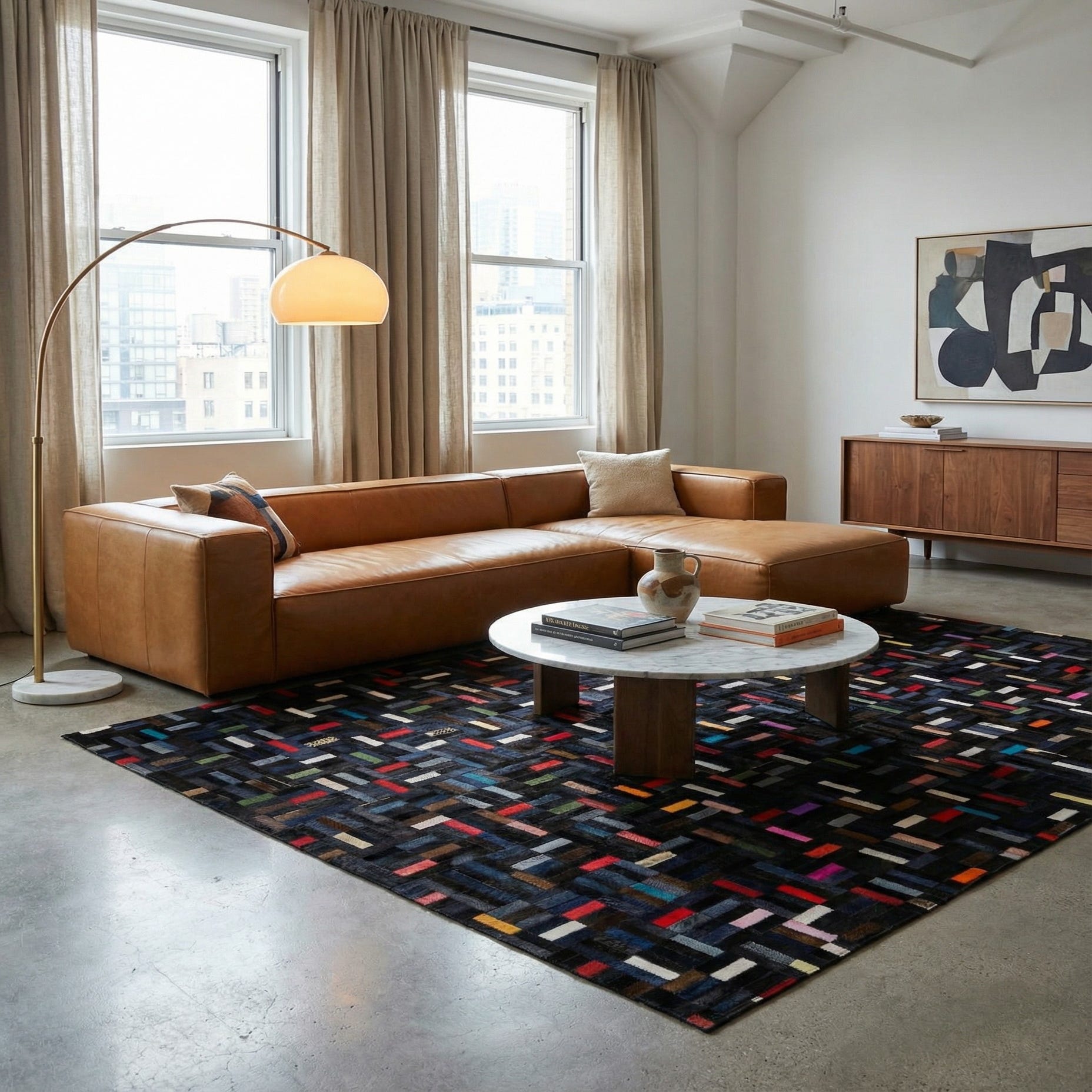 A 5x8 rectangular Cowhide Patchwork rug featuring a modern stripe pattern with multi-colored rectangular patches on a dark background.
