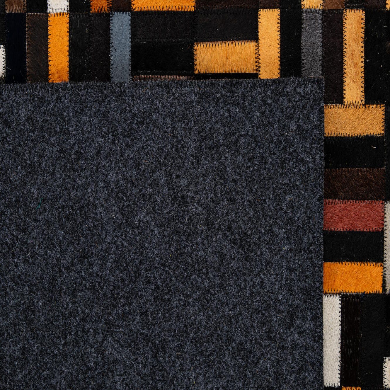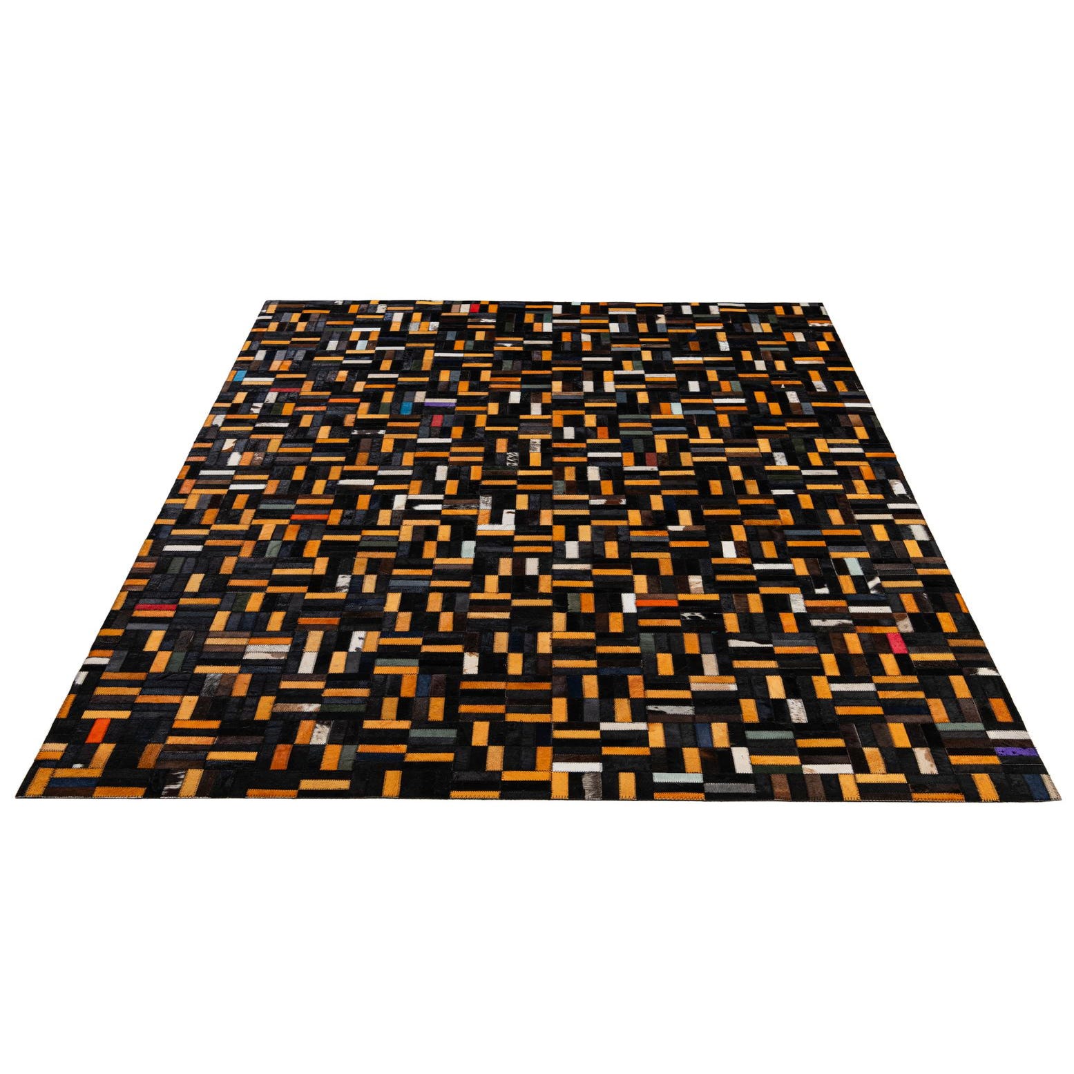 A 5x8 rectangular Cowhide Patchwork rug featuring a modern stripe pattern with black, orange, and multi-colored leather pieces.