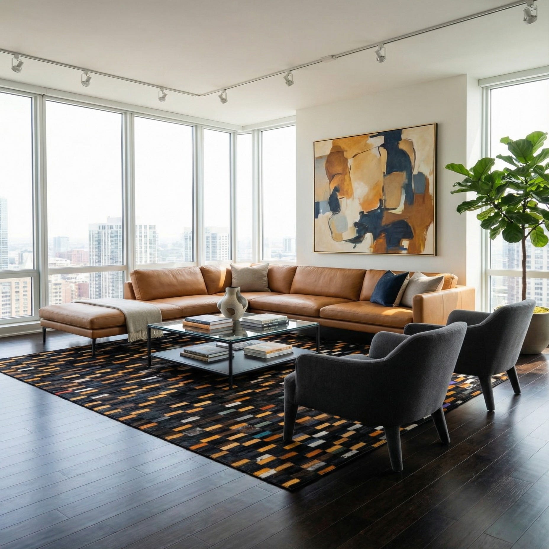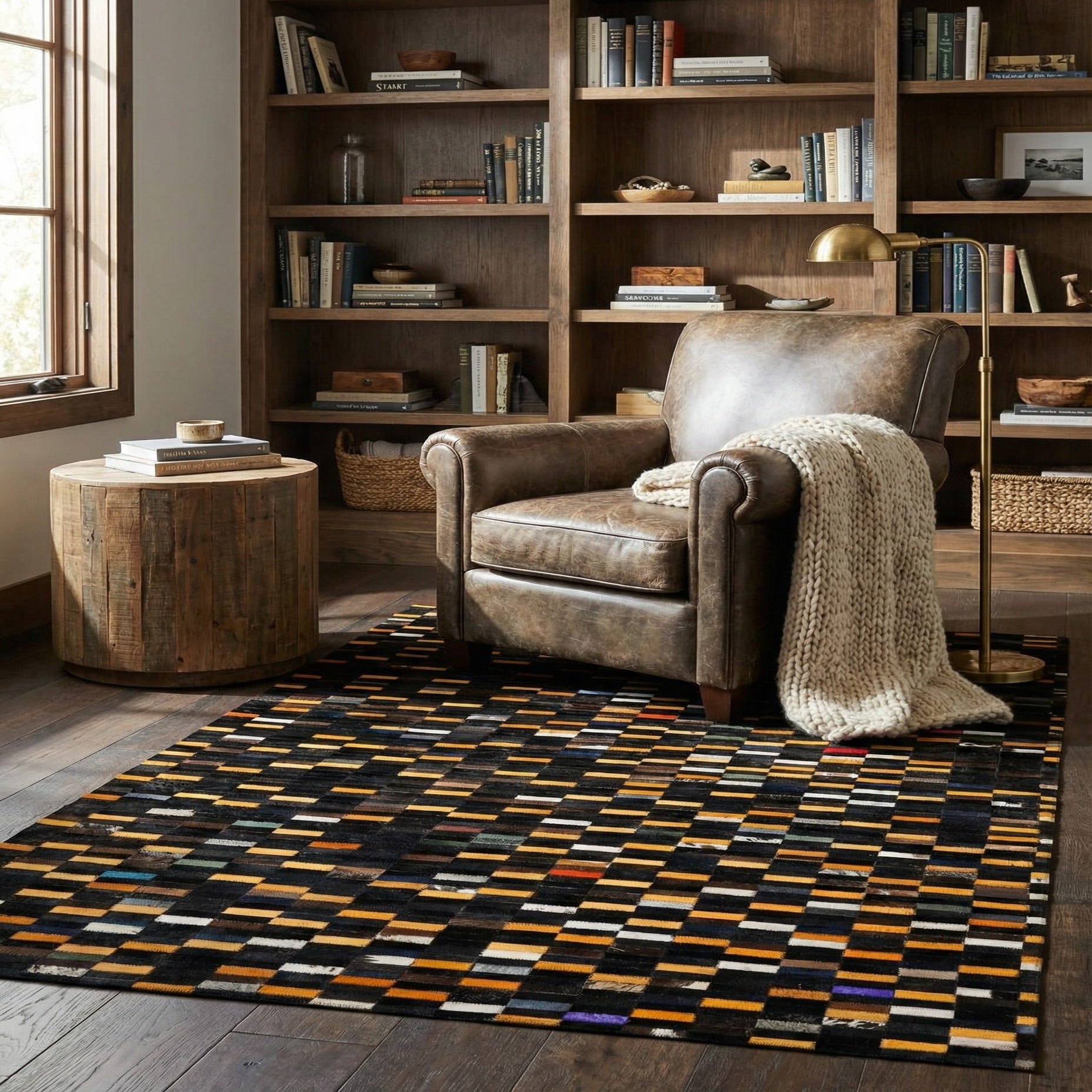 A rectangular 5x8 multi-colored modern patchwork cowhide rug with black, orange, and various accent color stripes.