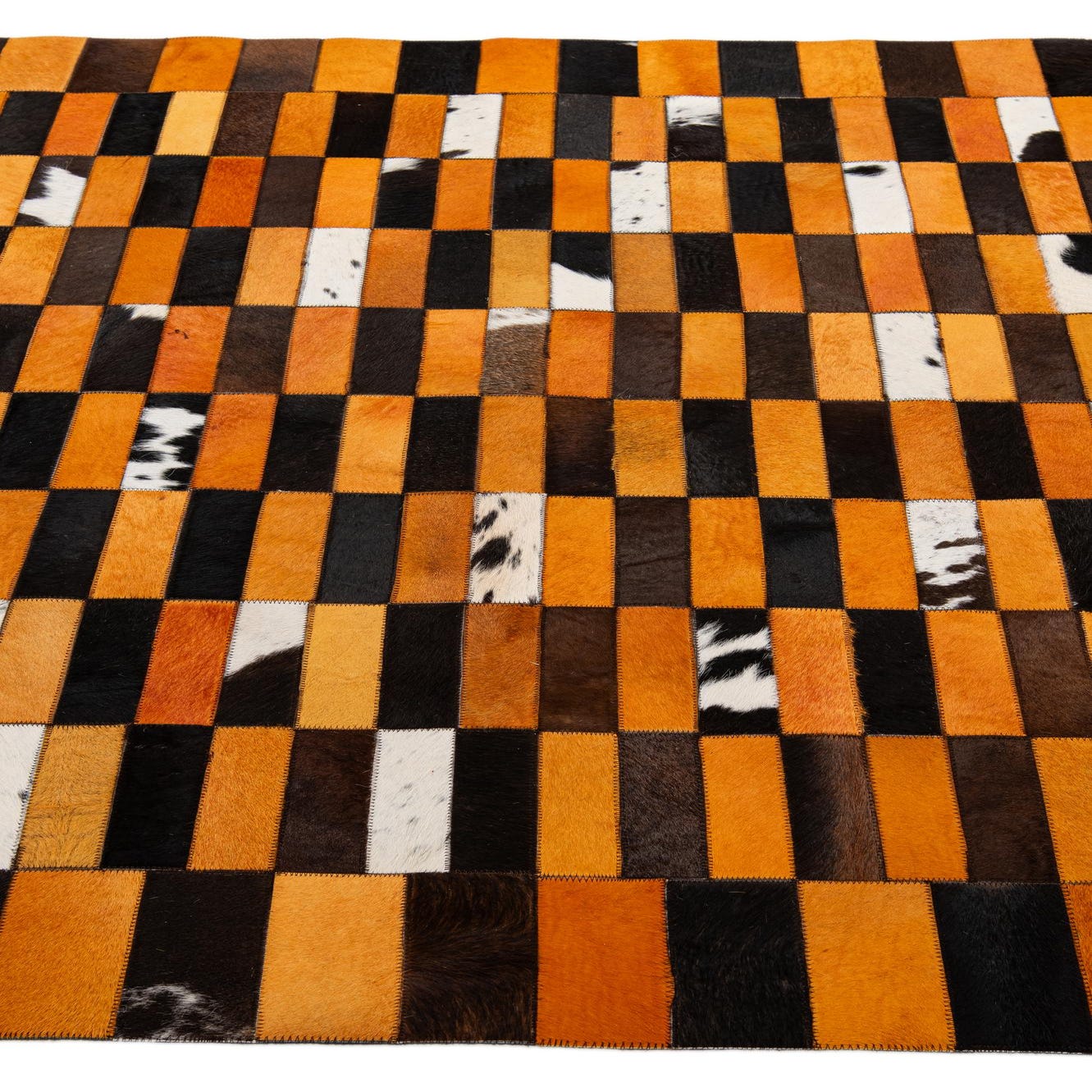 A 5x8 rectangular Cowhide Patchwork rug featuring a modern checkered pattern in multi-colored natural cowhide and leather.