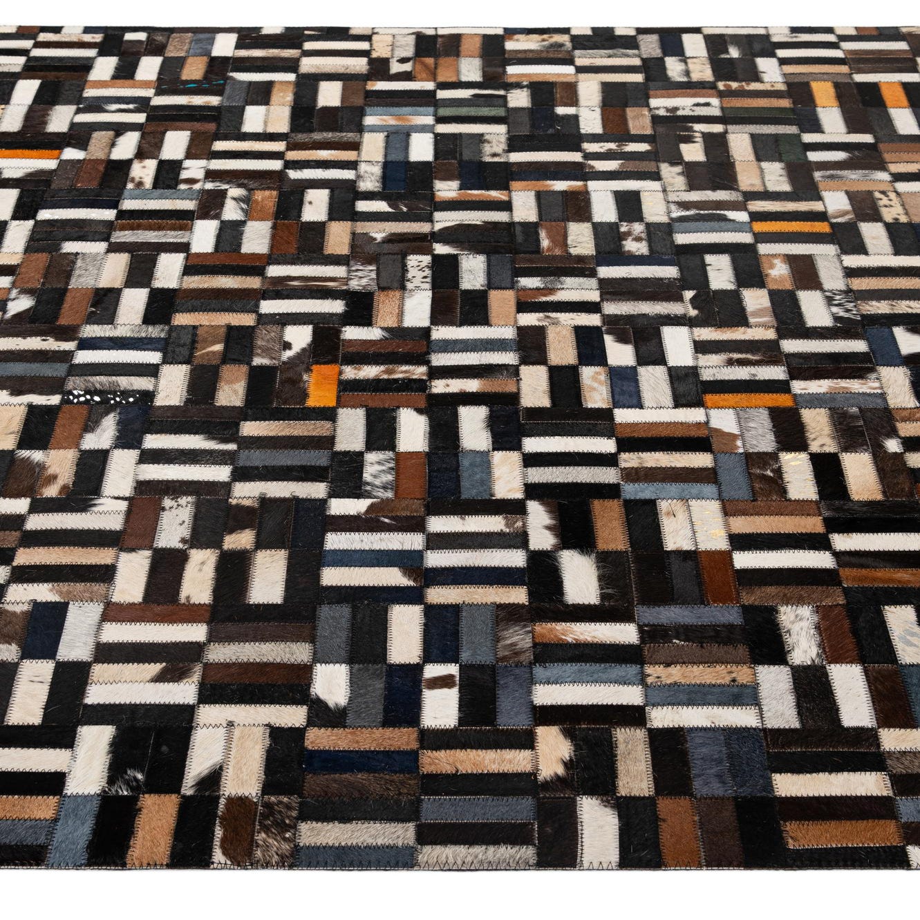 A 5x8 rectangular, multi-colored modern patchwork cowhide rug with various shades of brown, black, white, and orange leather pieces.