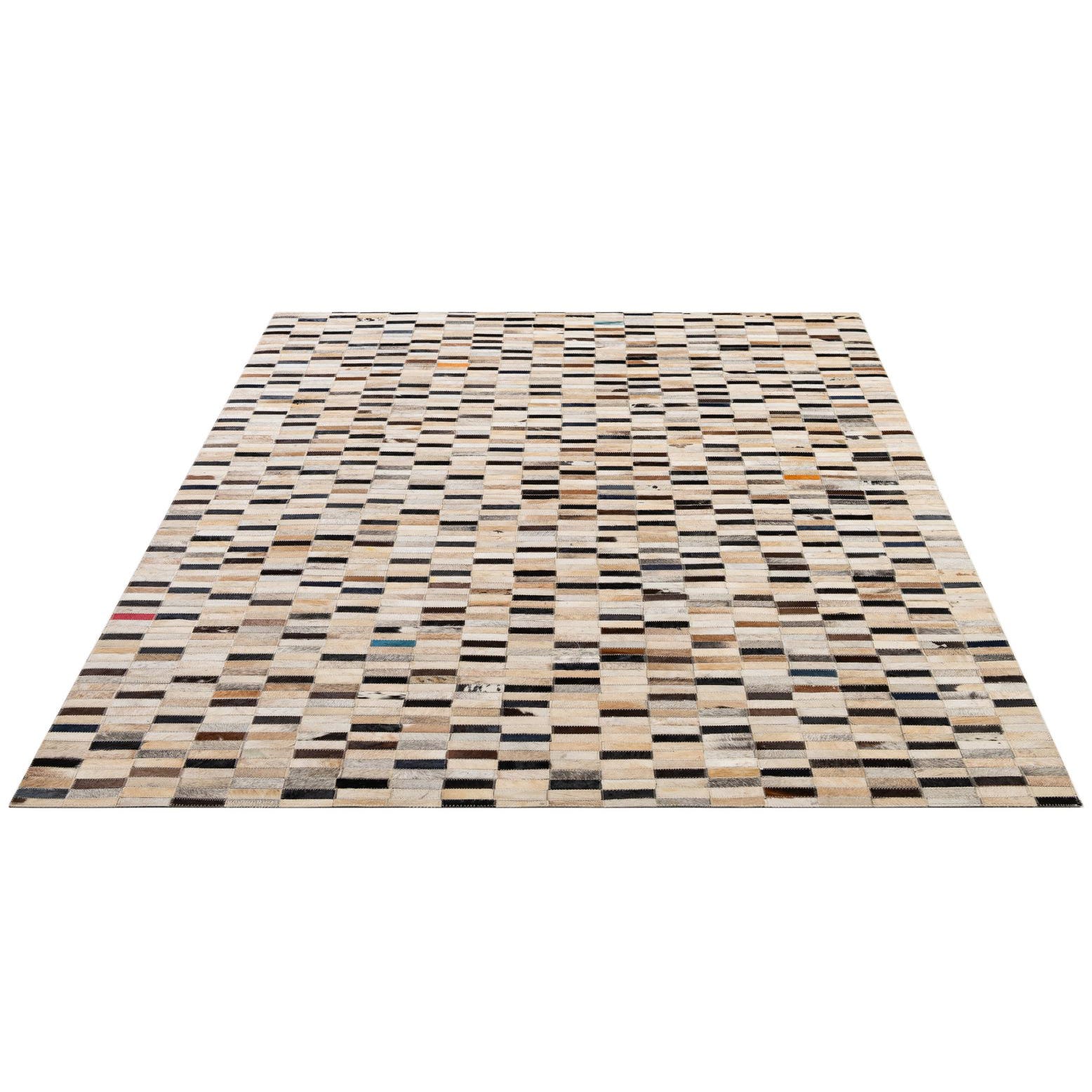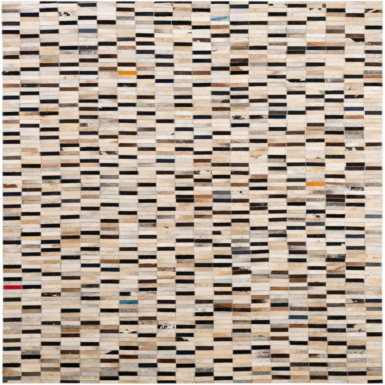 A 5x8 rectangular Cowhide - Patchwork rug featuring a modern stripe pattern in multi-colored natural cowhide and leather.