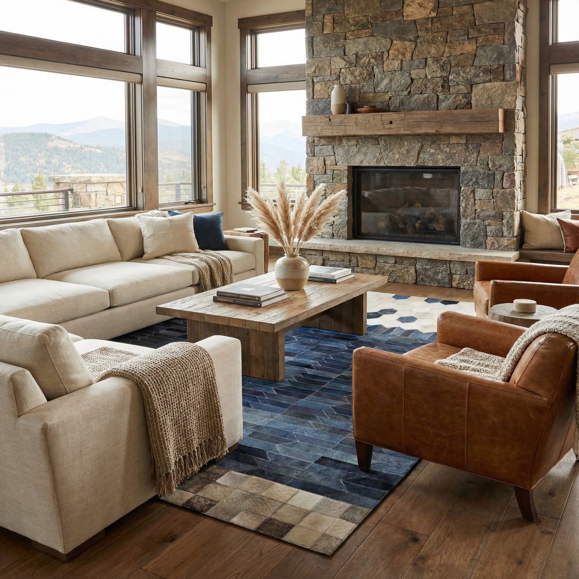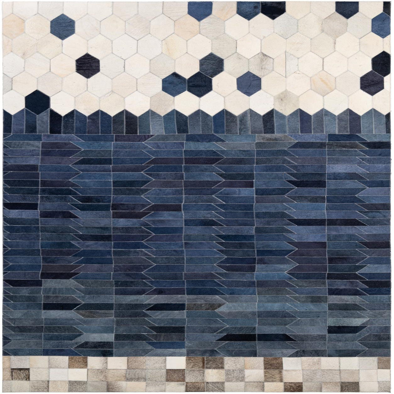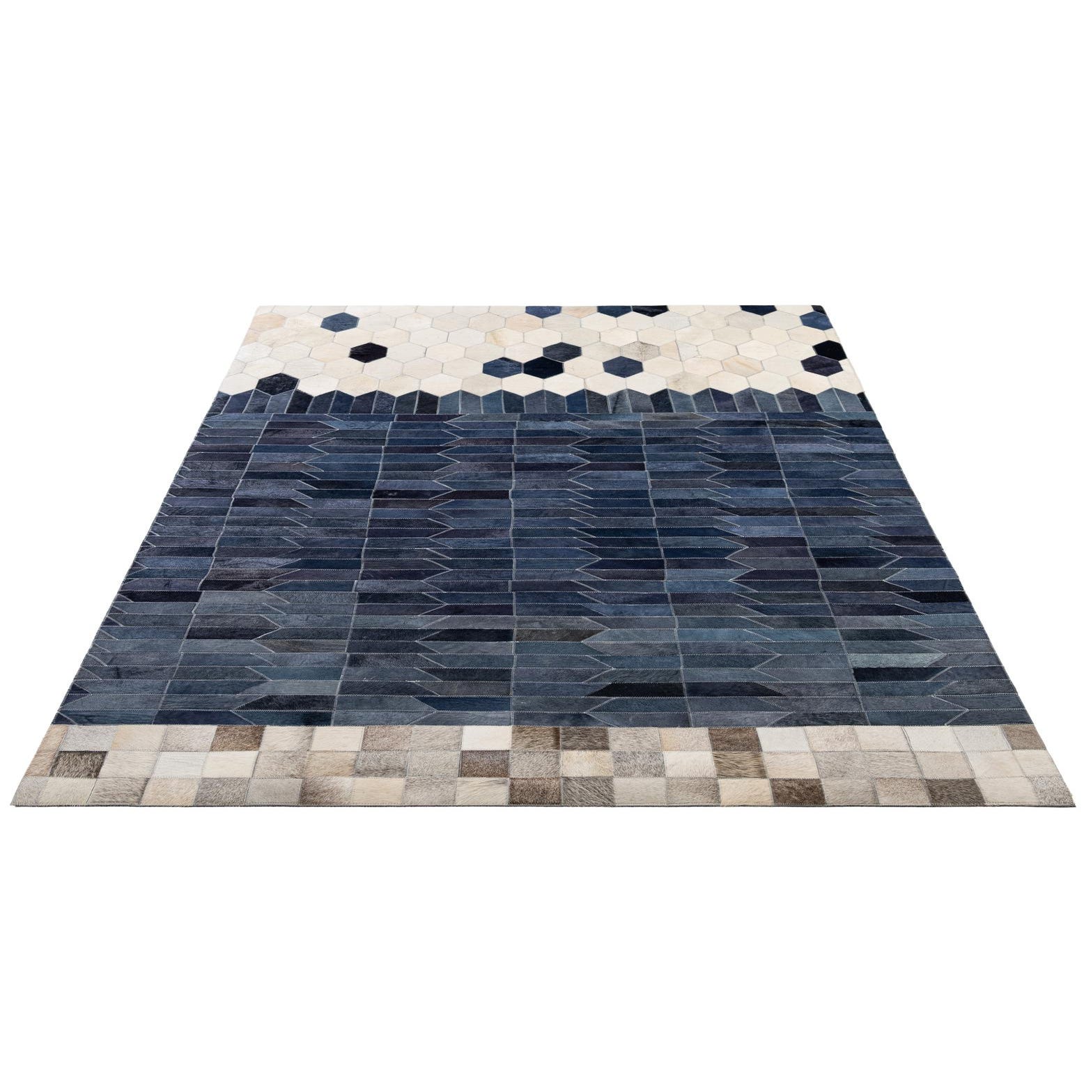 A 5x8 rectangular Cowhide - Patchwork rug featuring a modern geometric pattern in shades of blue, white, and brown.