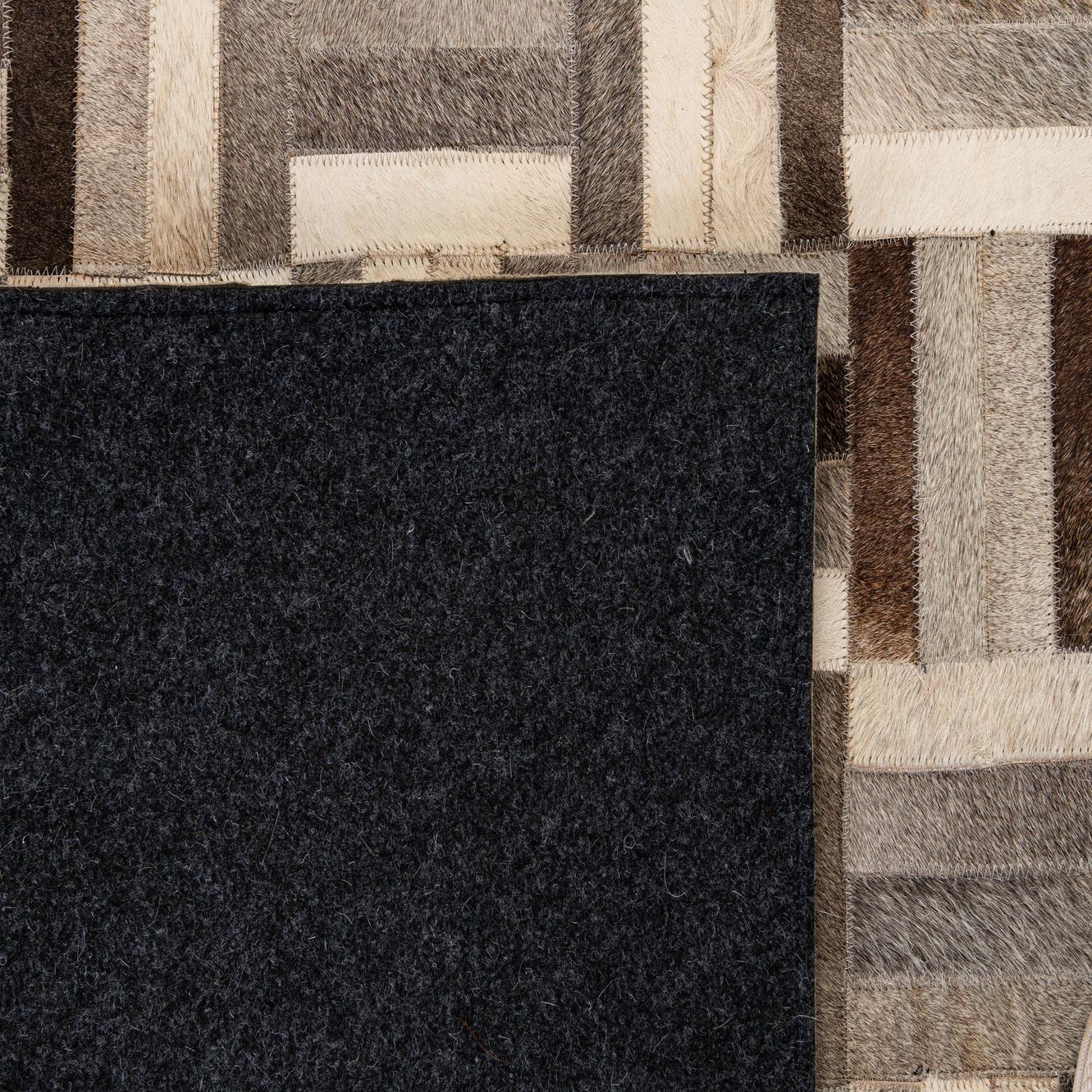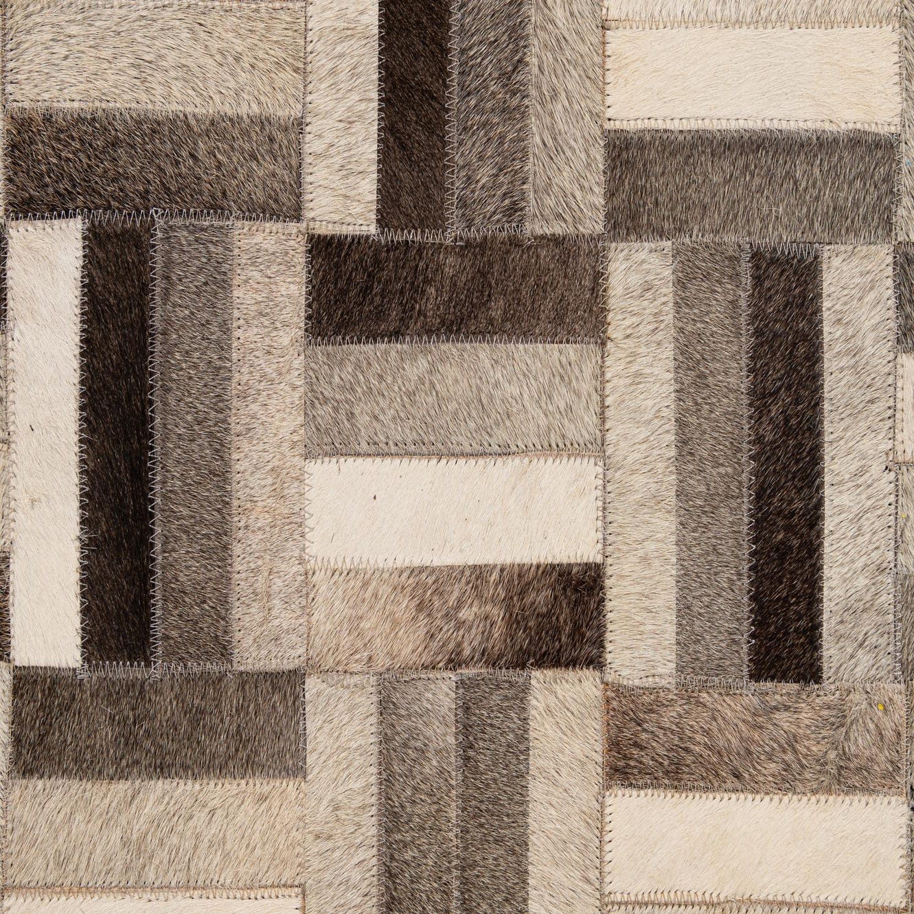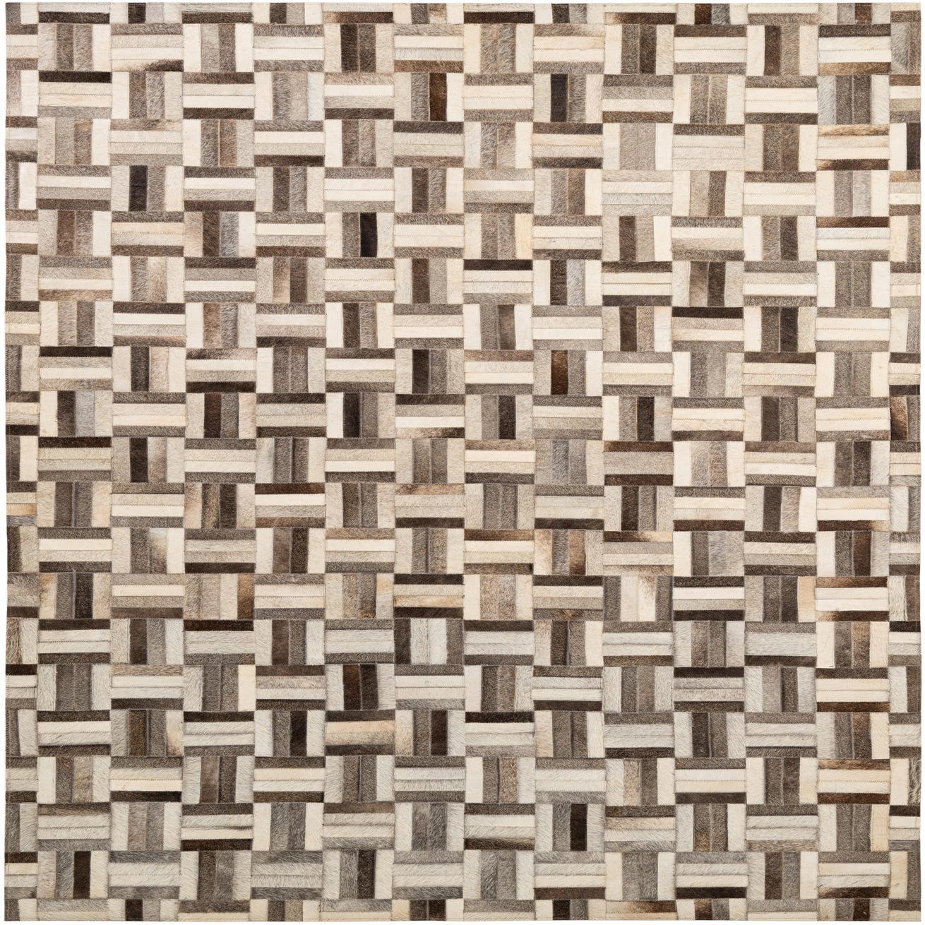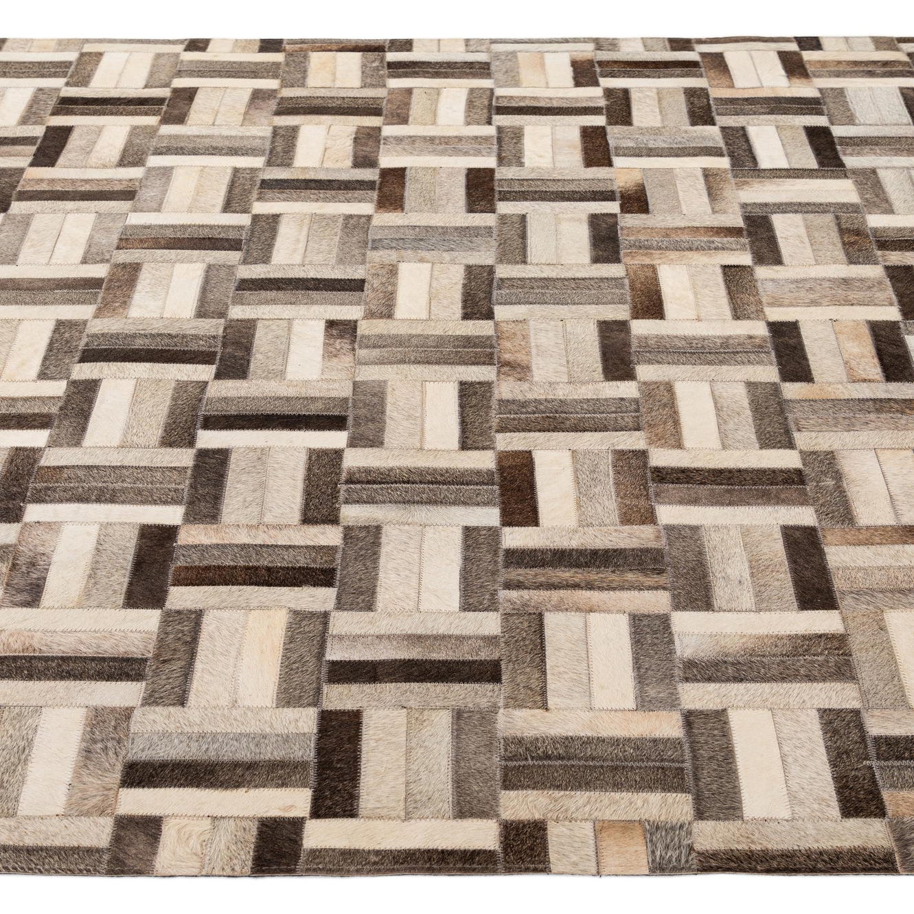 A 5x8 rectangular Cowhide - Patchwork rug featuring a modern geometric pattern in various shades of brown, grey, and cream.