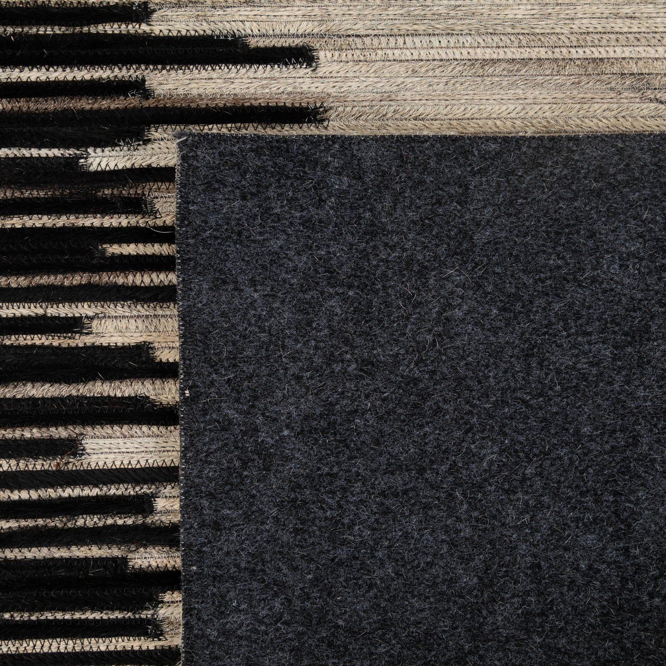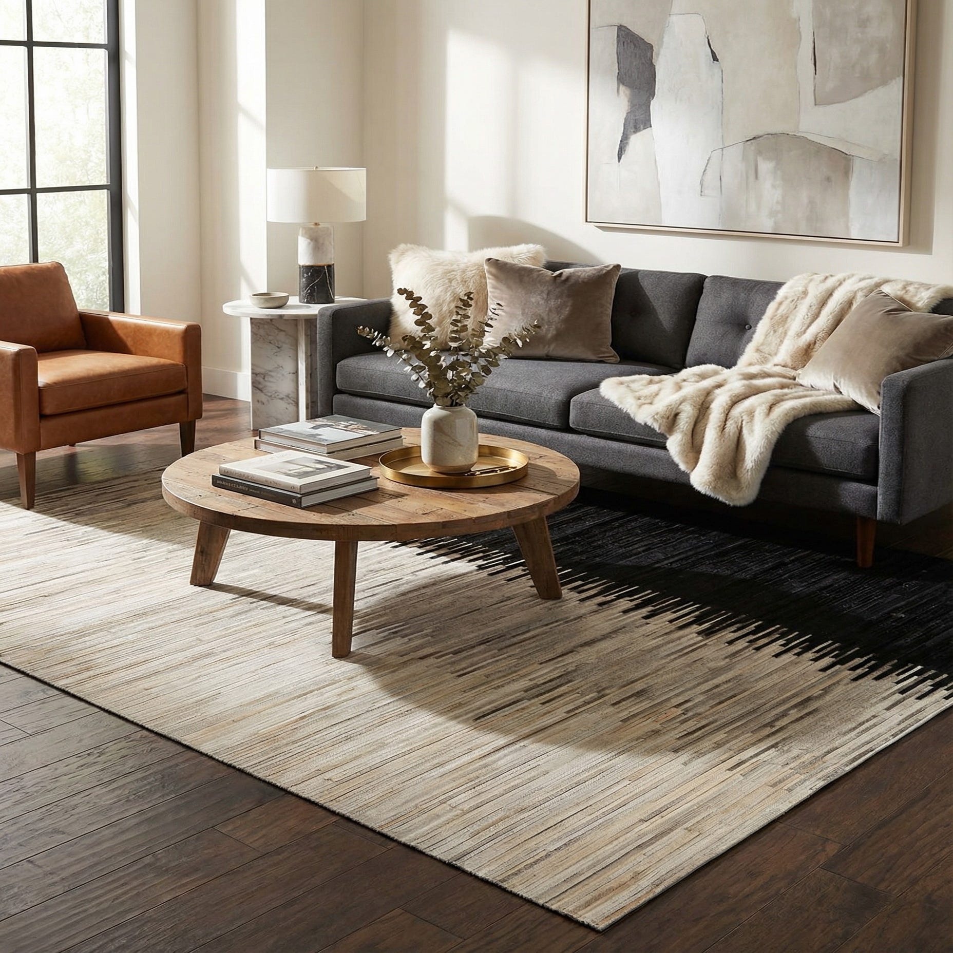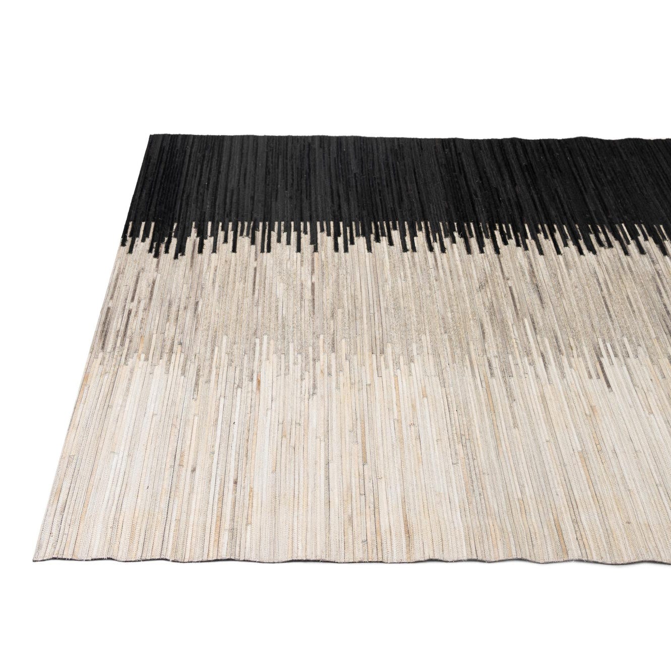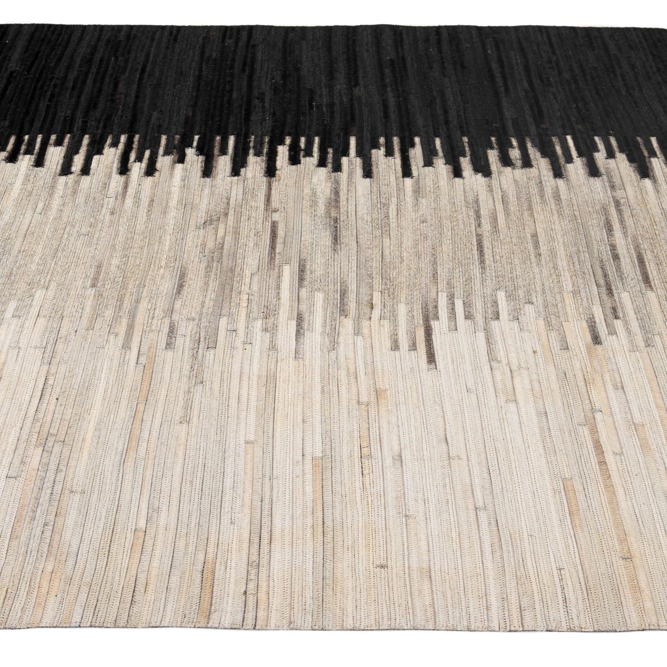 A 5x8 rectangular Cowhide Patchwork rug featuring a modern design with multi-colored strips, transitioning from light tones to a solid black section.