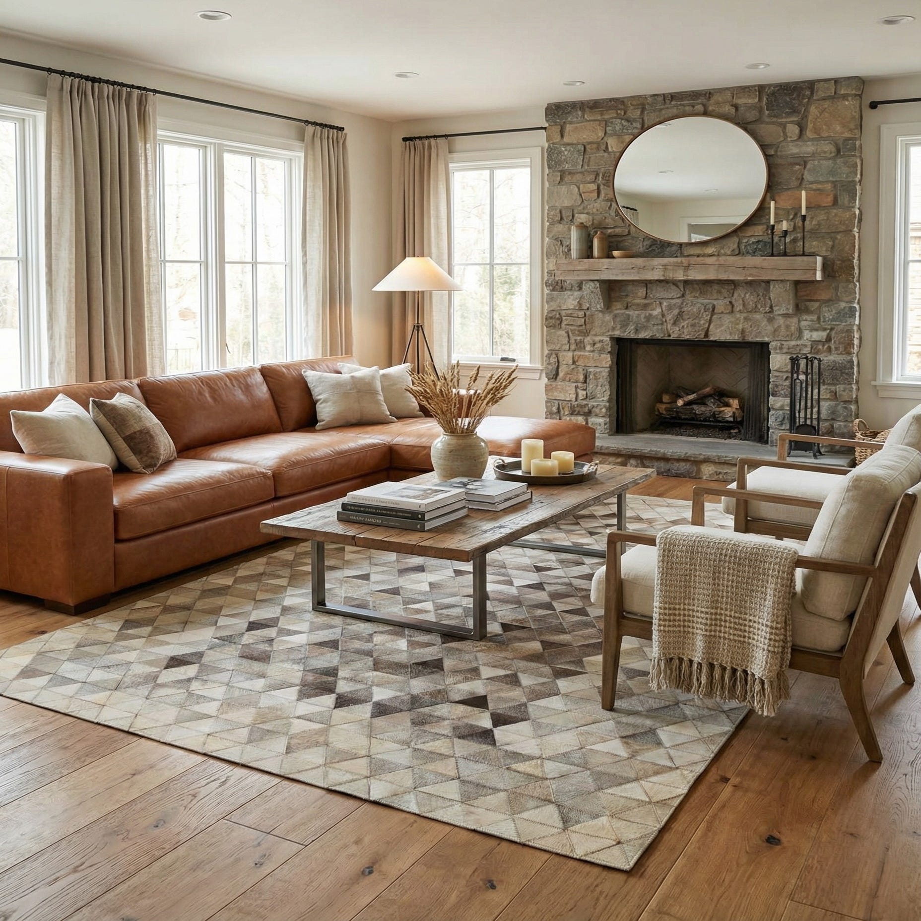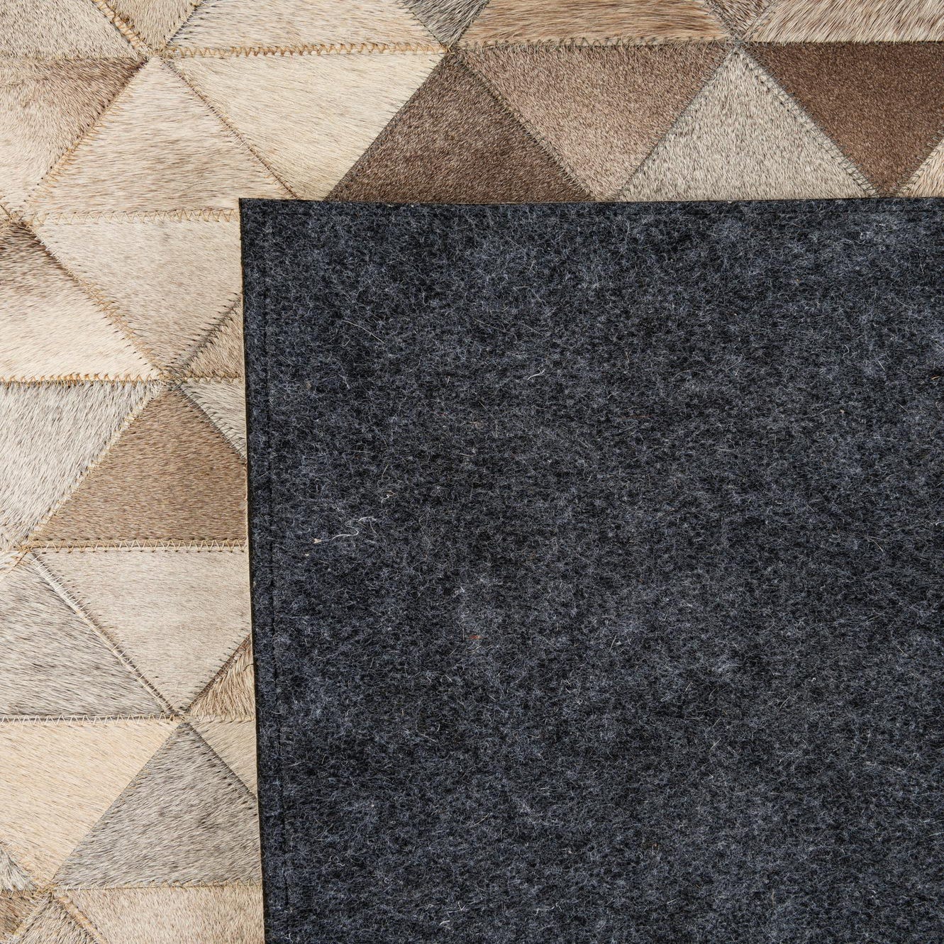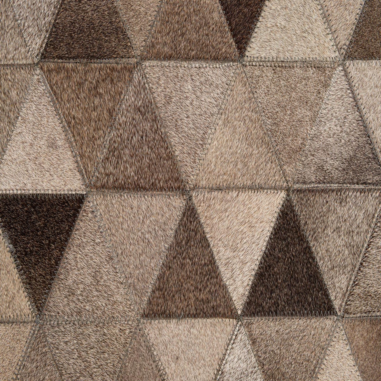 A 5x8 rectangular Cowhide Patchwork rug featuring a modern geometric pattern of multi-colored triangular leather pieces in shades of brown, beige, and cream.