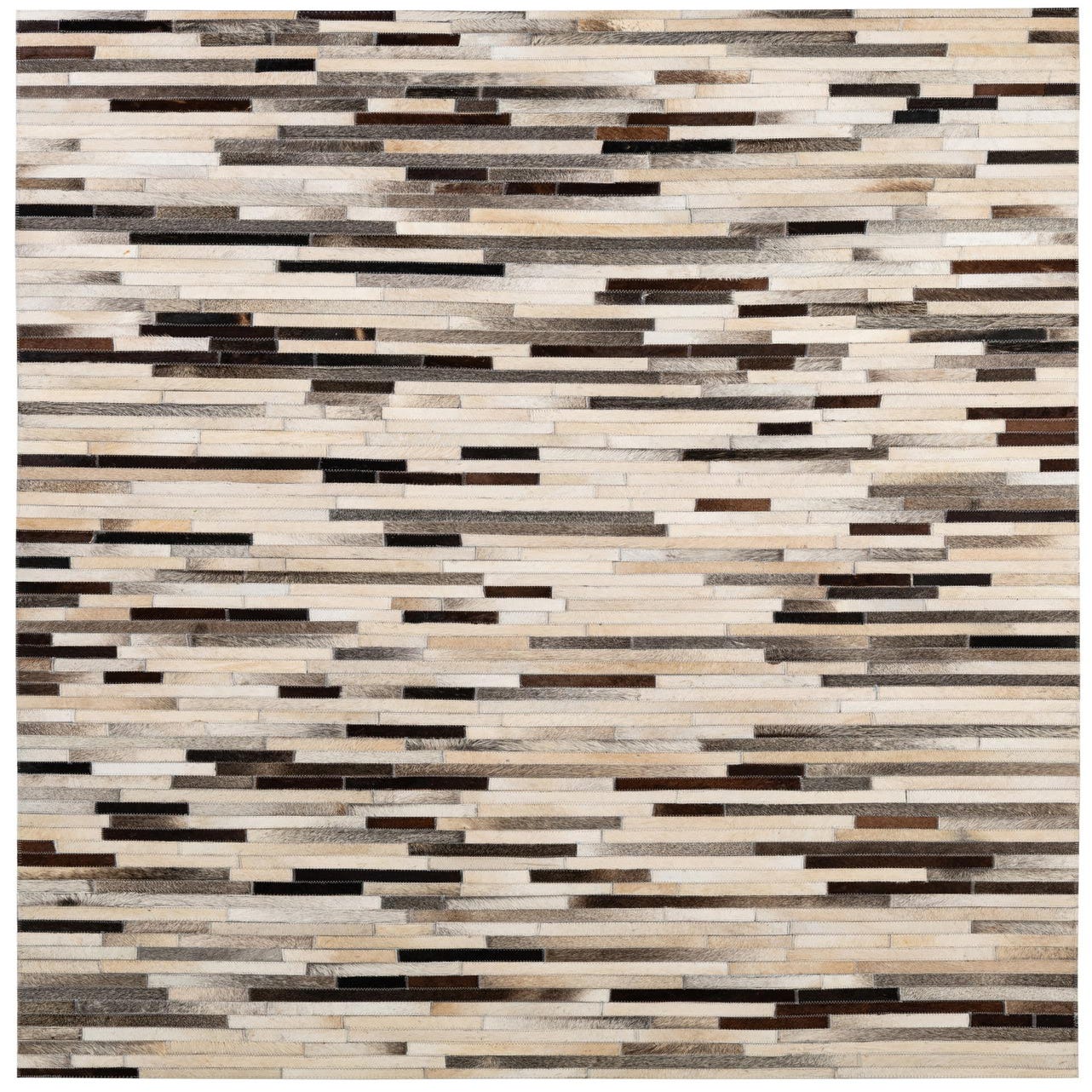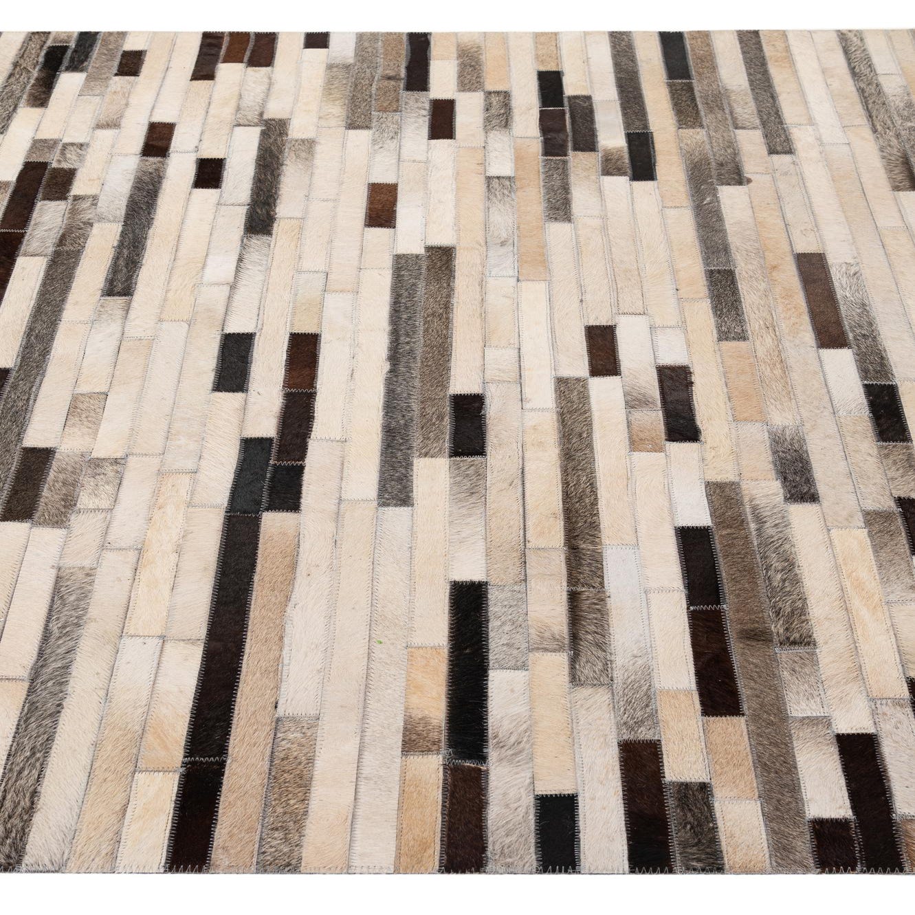 A 5x8 rectangular Cowhide - Patchwork rug featuring a modern stripe pattern in multi-colored natural tones.