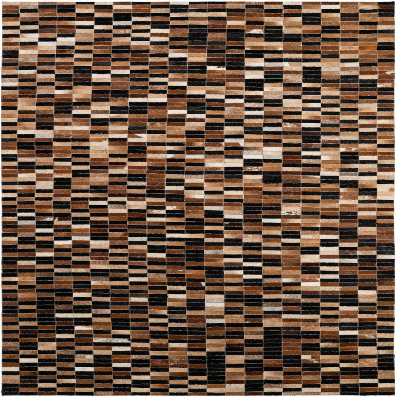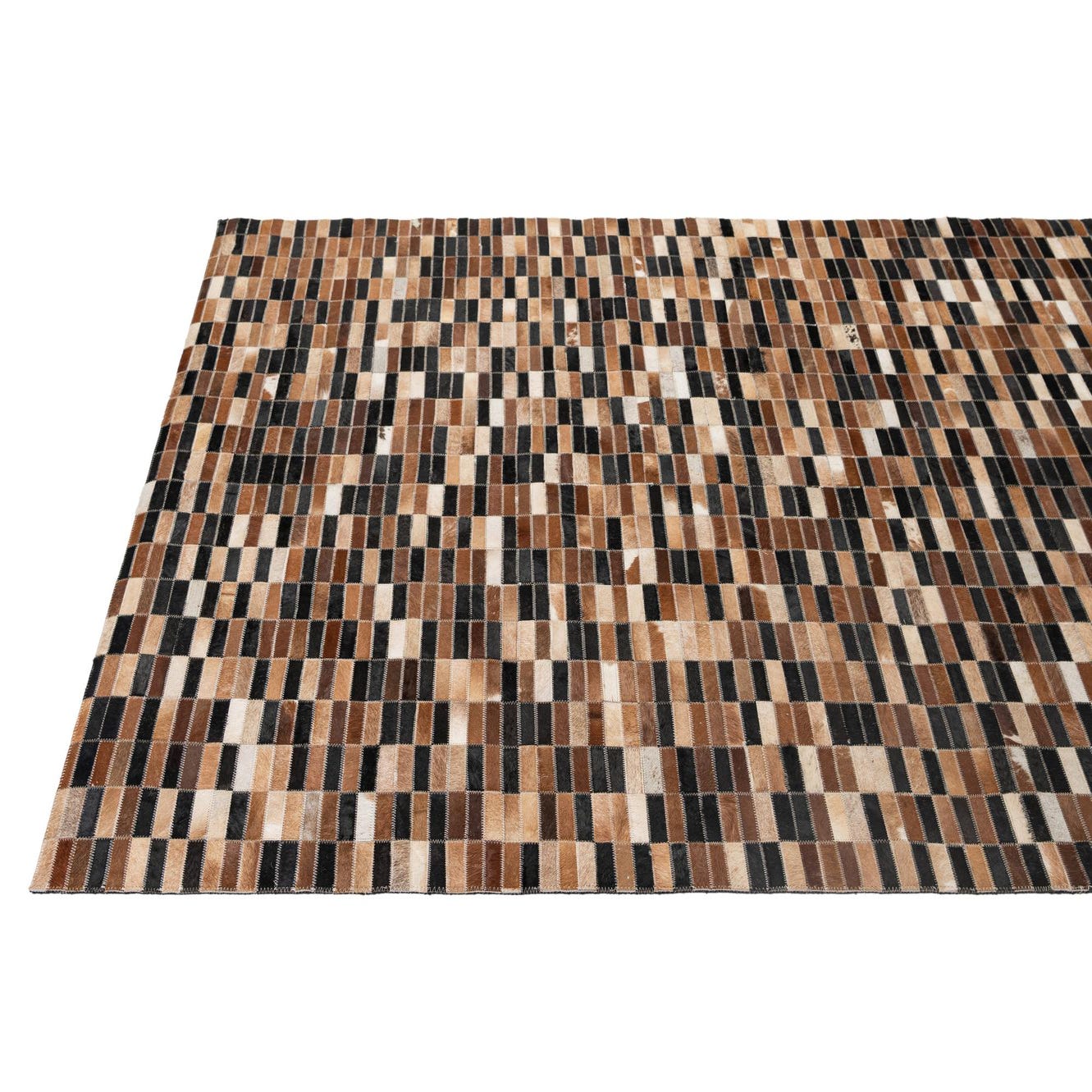 A 5x8 rectangular modern rug made from patchwork cowhide and leather in varying shades of black, brown, and tan.