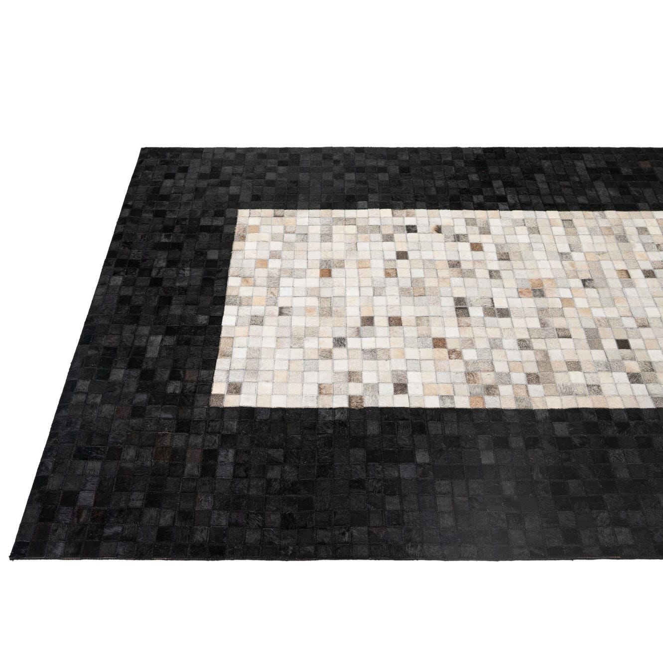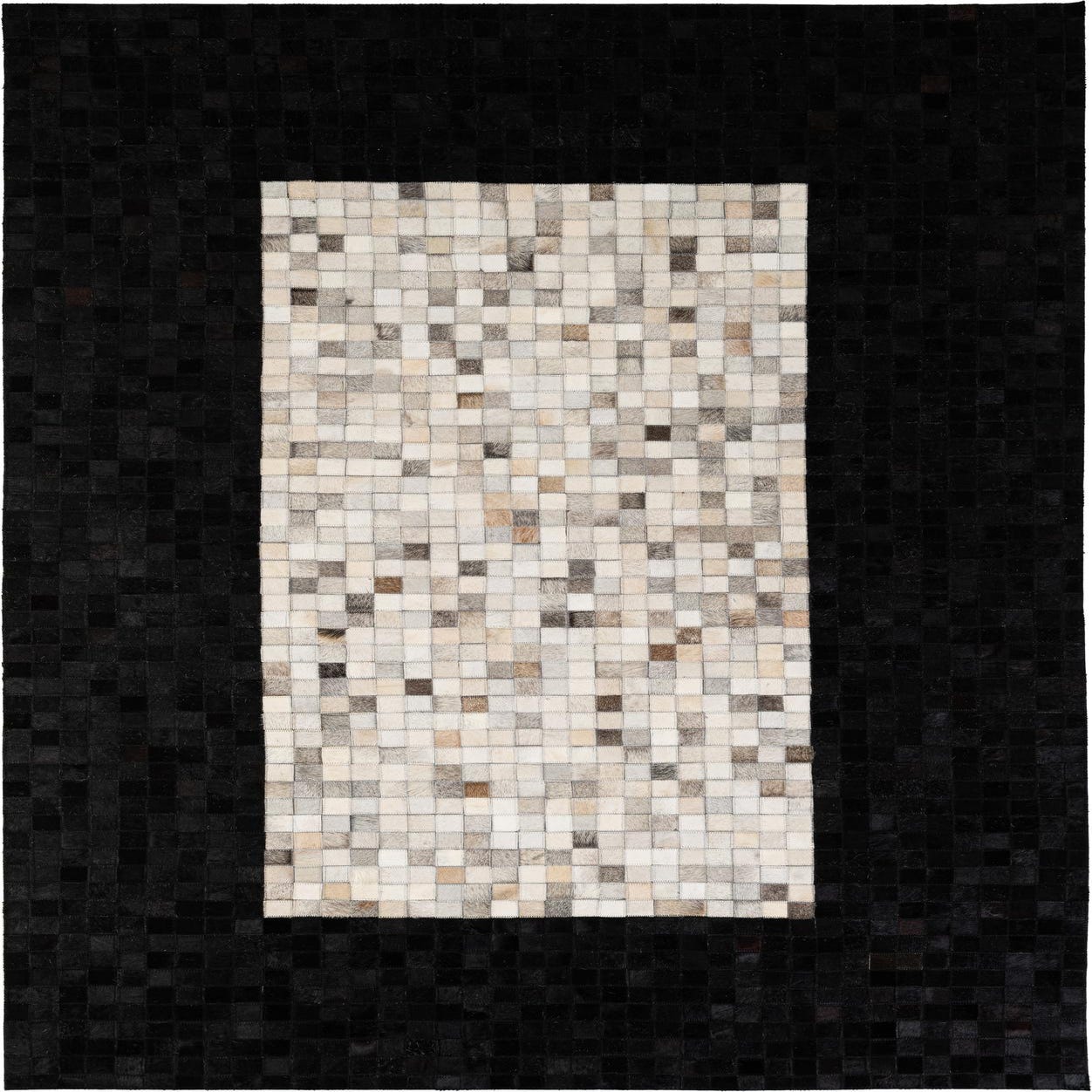 A 5x8 rectangular Cowhide Patchwork rug featuring a multi-colored pixelated center framed by a solid black border.