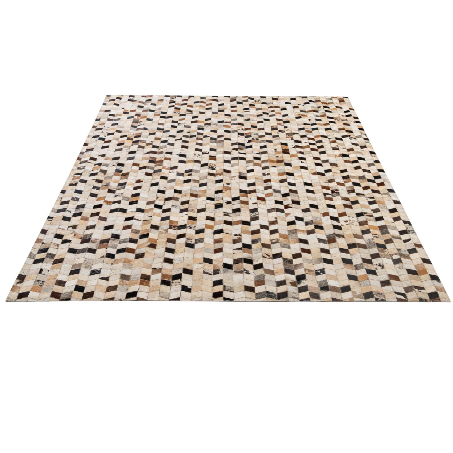 A 5x8 rectangular Cowhide - Patchwork rug featuring a modern chevron pattern in multi-colored natural cowhide and leather.