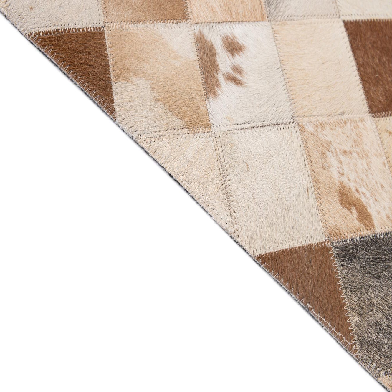 A 5x8 rectangular Cowhide Patchwork rug featuring a modern diamond pattern in various shades of brown, beige, and white.