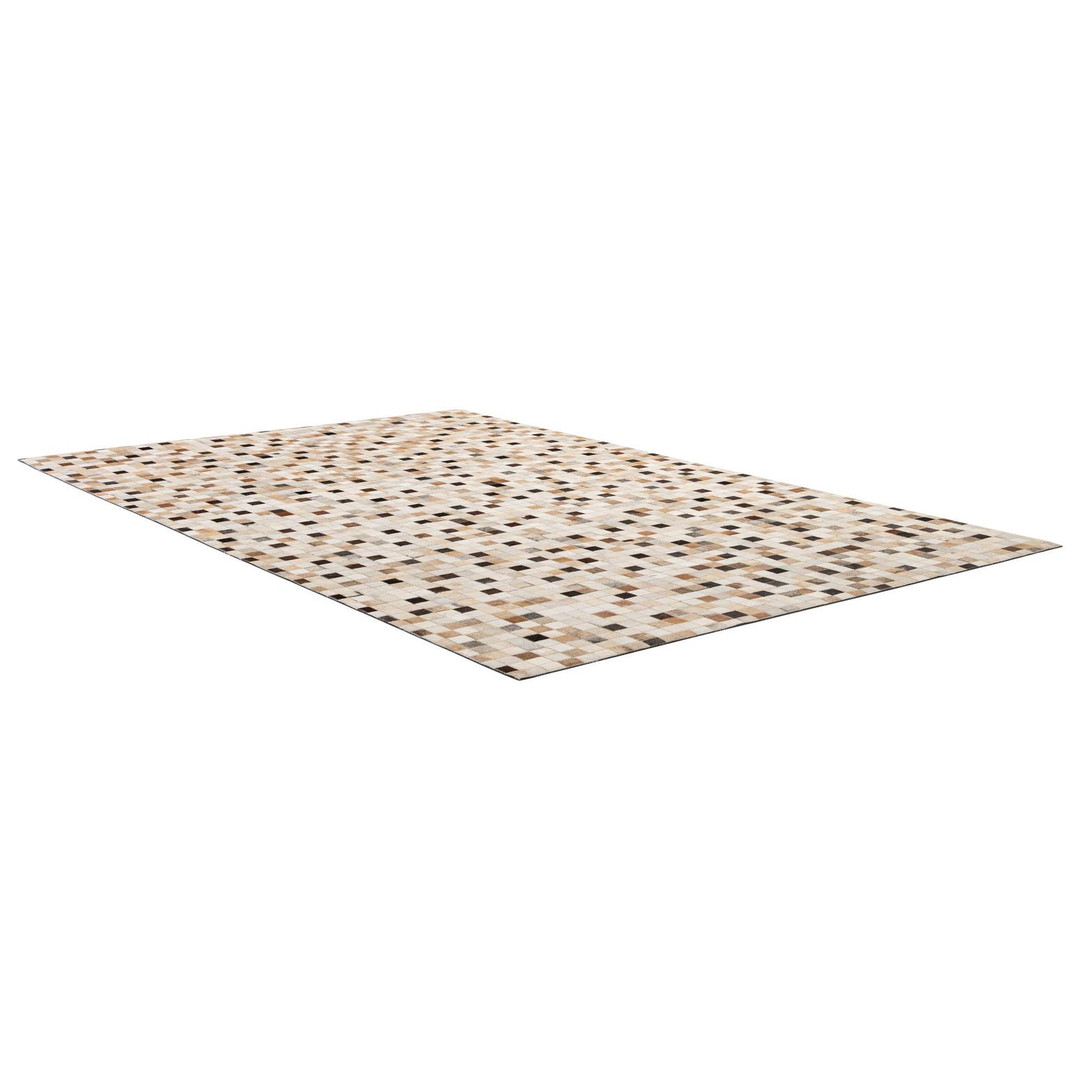 A 5x8 rectangular Cowhide Patchwork rug featuring a modern pattern of multi-colored squares in varying shades of brown, beige, and black.