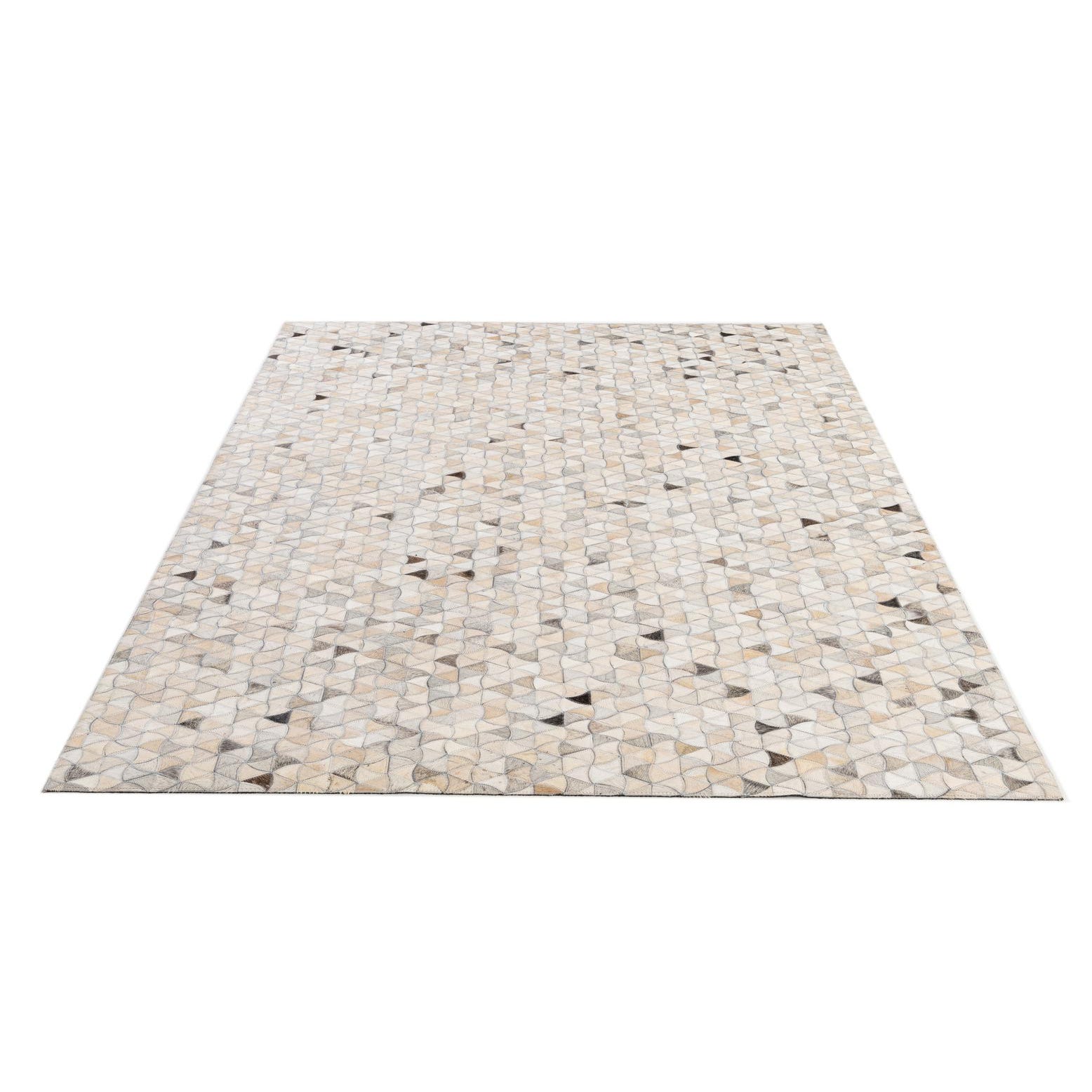 A 5x8 rectangular Cowhide - Patchwork rug featuring a modern geometric pattern in multi-colored natural cowhide and leather.